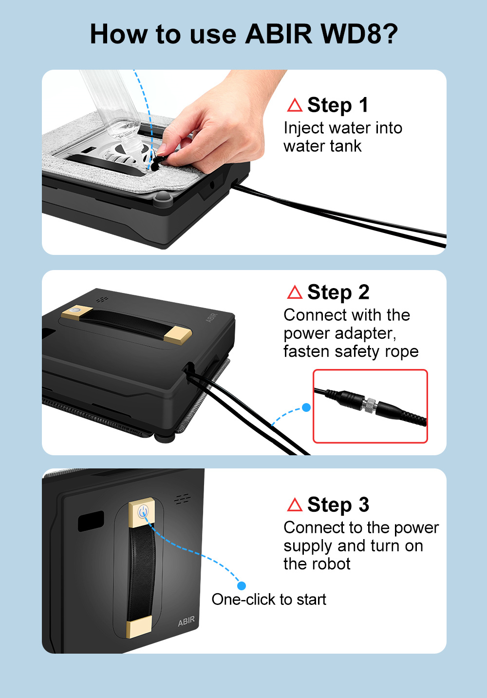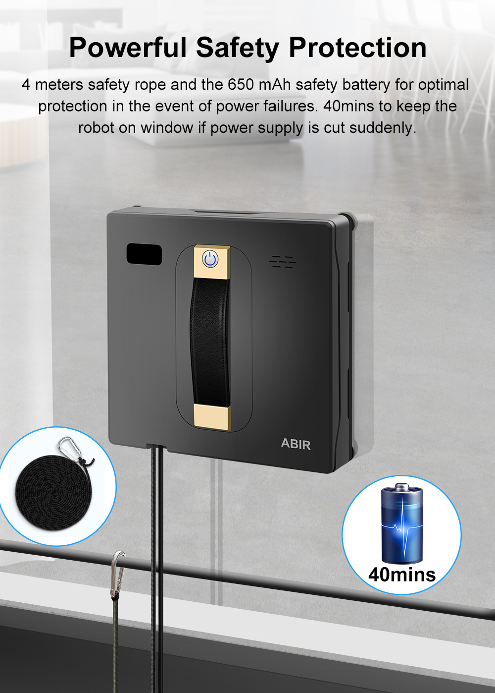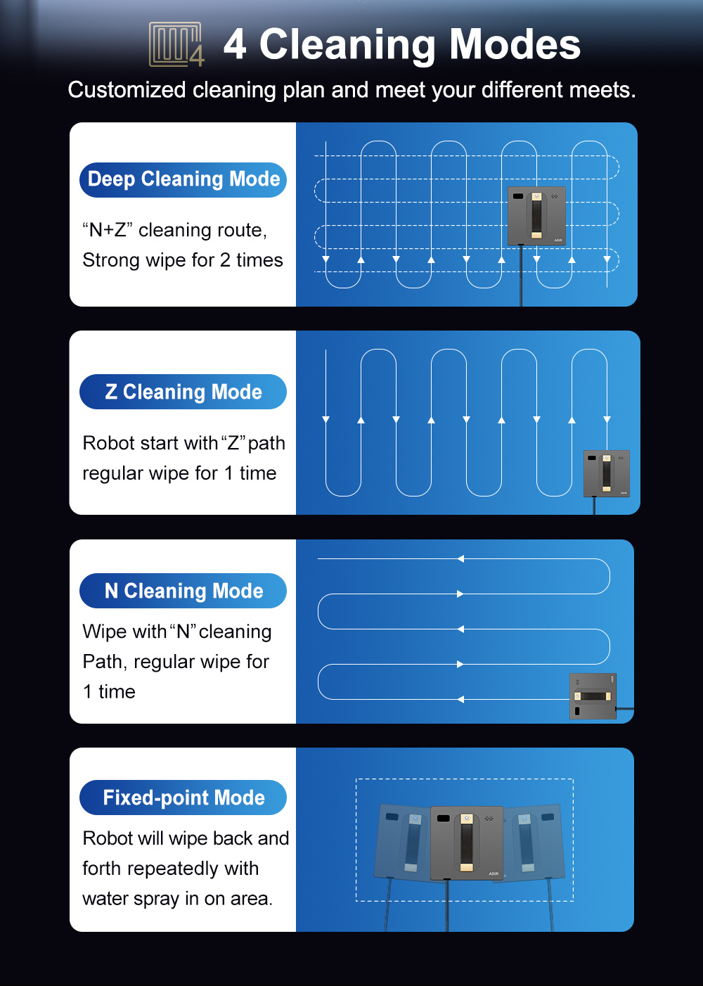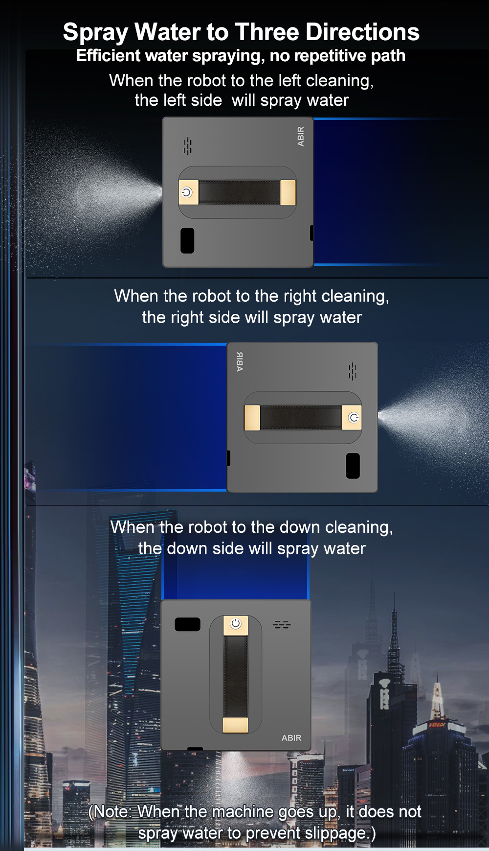ABIR WD8 on ikkunanpesurobotti, joka yhdistää 3000Pa imutehon, harjattoman moottorin ja SLAM 4.0 -navigoinnin tasaisen ja varman puhdistuksen saavuttamiseksi. Automaattinen ja manuaalinen vesisumutus, useat puhdistustilat sekä kaukosäädin- ja sovelluskäyttö tekevät käytöstä sujuvaa. UPS-järjestelmä tarjoaa turvaa mahdollisten virtakatkojen varalta.