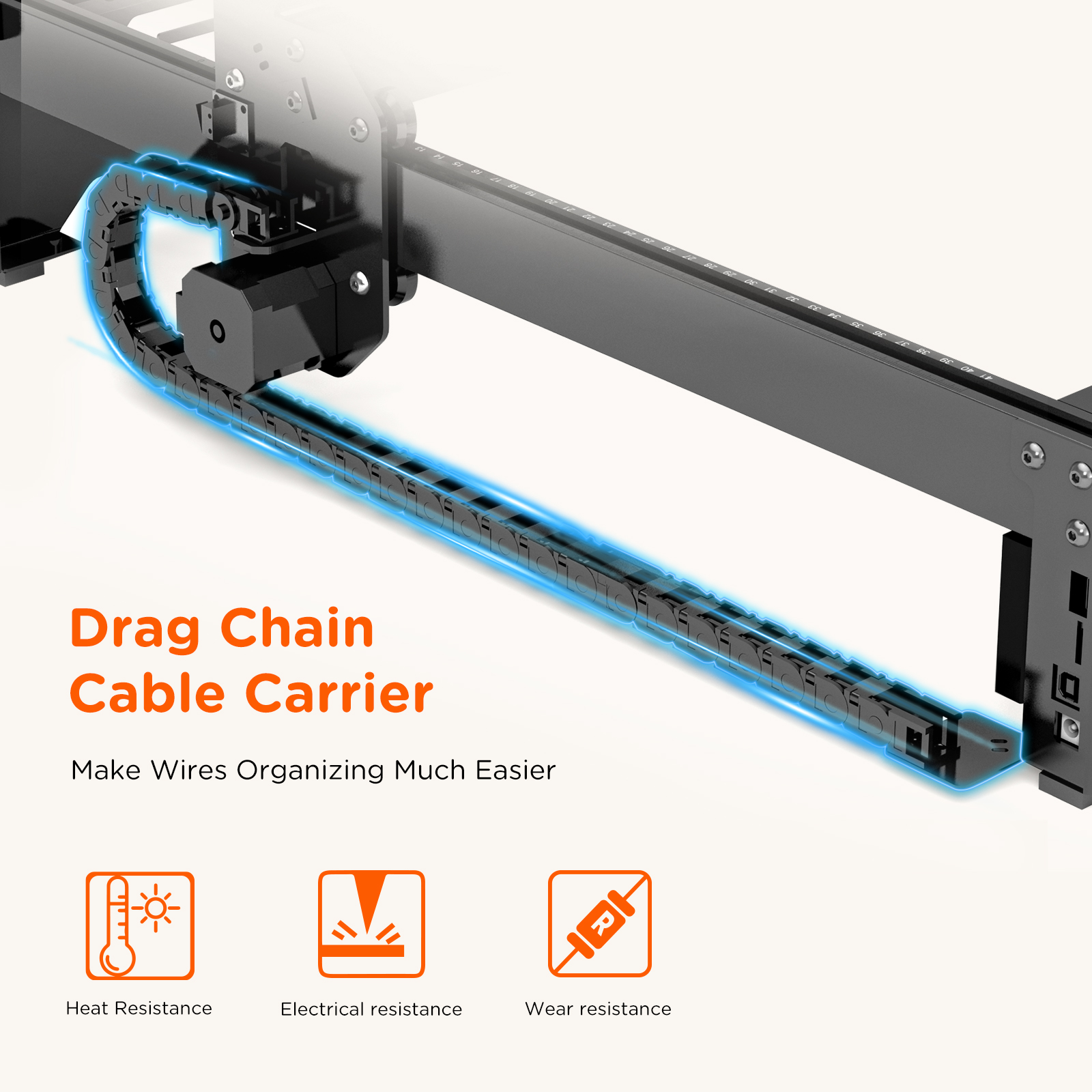 - Offline-kaiverrus ja turvatoiminnot: sisäinen ESP-32-DOWD-VS -piiri ja 32-bittinen LX6-mikroprosessori. Käyttö Wi‑Fi-yhteydellä, TF-kortilla tai USB:llä ilman johtosotkua. Hätäpysäytys ja kaatumissuoja pysäyttävät työn poikkeustilanteissa.