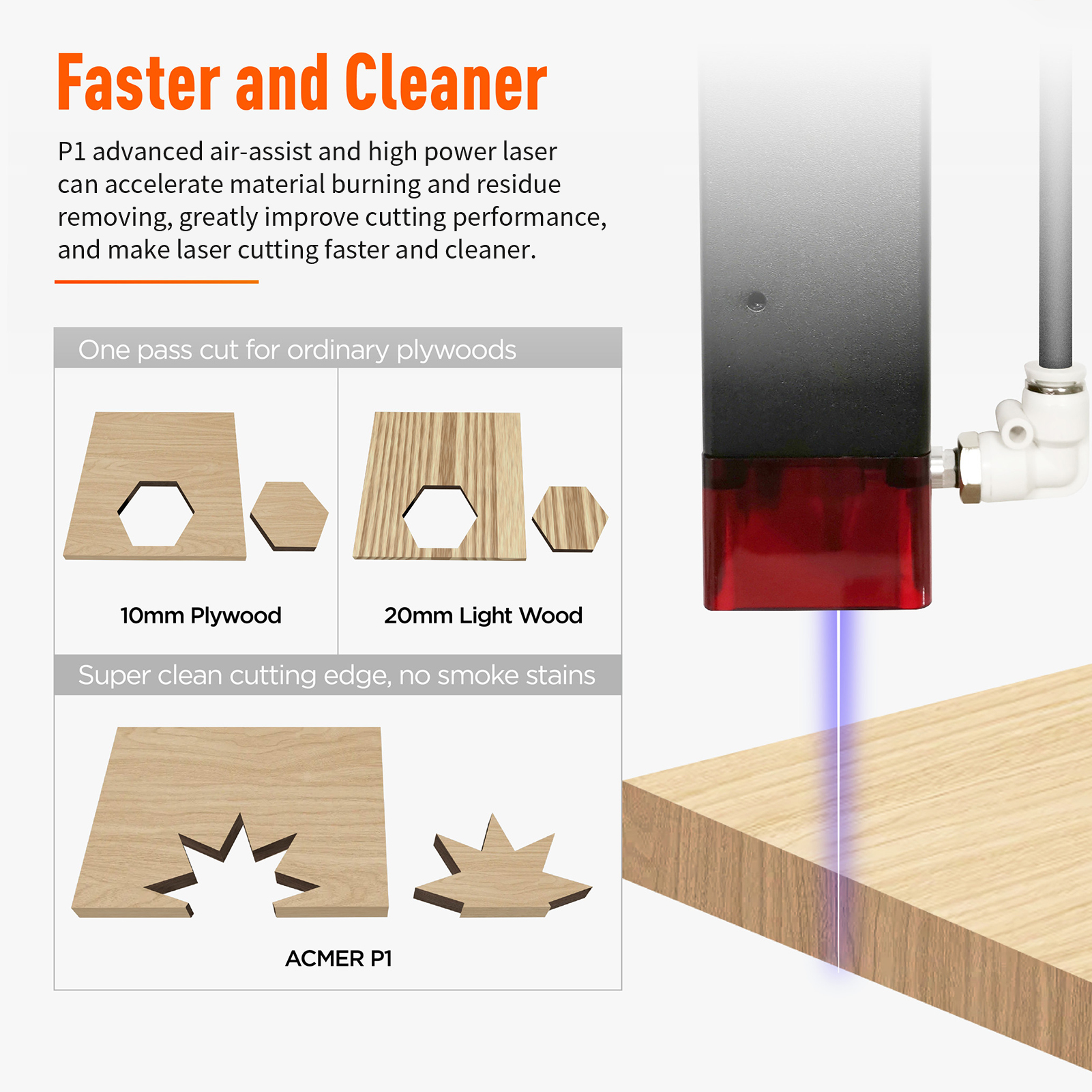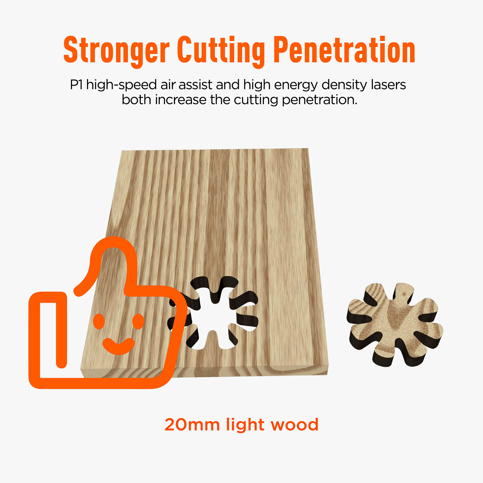 - Vahva leikkausläpäisy: nopea ilmapuhallus ja suuri energiatiheys mahdollistavat useampien materiaalien leikkauksen, myös tiheiden puiden kuten MDF ja pähkinäpuu, jotka ovat haastavia tavanomaisille lasereille.