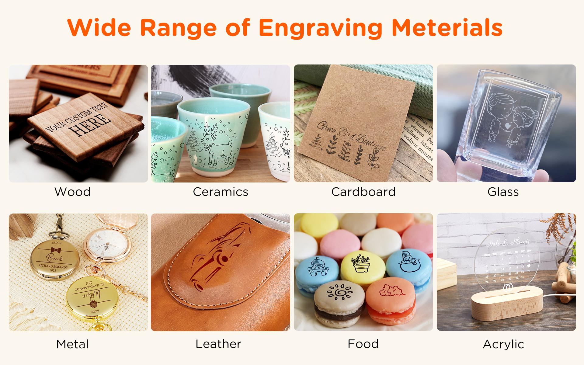 Kaiverrettavat materiaalit: puu, muovi, paperi, nahka, bambu, ruostumaton teräs, teräs, siksak-levy, akryyli, lasi, jne.