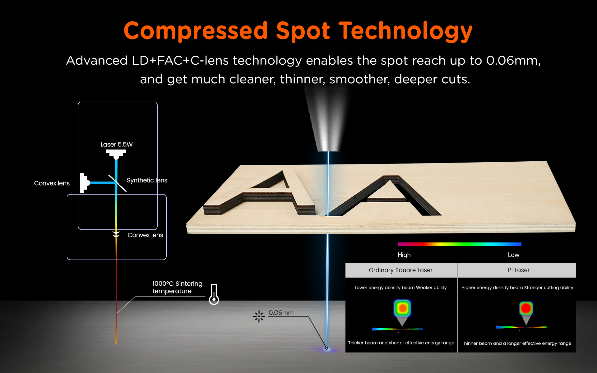 - 10W laserkaiverrus: P1 -laitteen laserin lähtöteho on 10W ja 0.08 mm tarkennus saavutetaan säteen muotoilulla. Korkeampi energiatiheys parantaa läpäisyä ja kaiverrus-/leikkauskykyä.