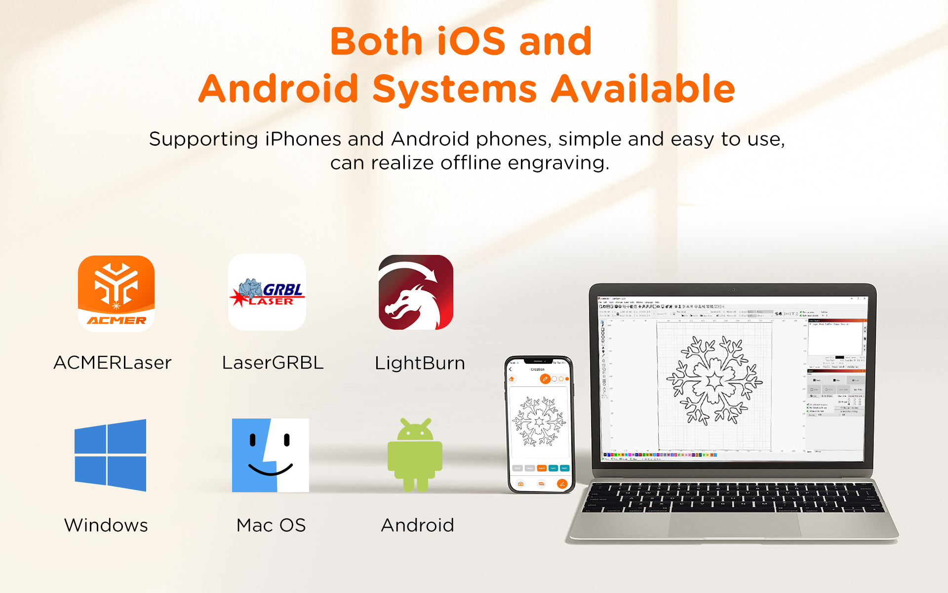 - Laaja yhteensopivuus: toimii LightBurn- ja LaserGRBL-ohjelmien kanssa, tukee Windows-, macOS-, iOS- ja Android-järjestelmiä. Kaiverrustiedostot: SVG, NC, BMP, JPG, PLT, PNG jne.