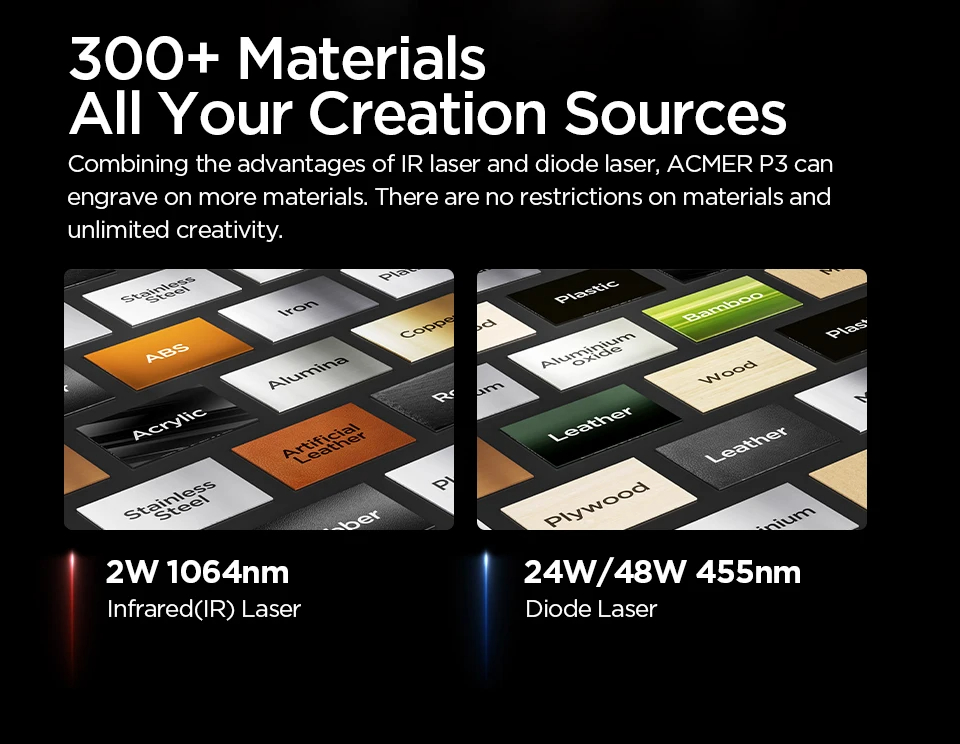 Tuetut materiaalit: puu, bambu, paperi, muovi, nahka, piirilevy (PCB), alumiinioksidi, heijastamaton pinnoite, lakattu metalli, keramiikka