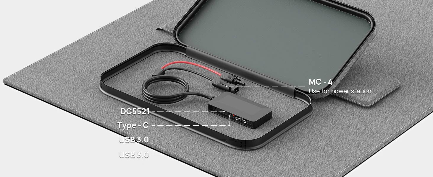 3. 5 ulostuloporttia: paneelissa on 5 latausulostuloa – Type-C 18W x 1, DC-ulostulo x 1, USB 3.0 x 2 sekä Multi-Contact 4 -liitin – joten voit ladata useita eri laitteita samanaikaisesti. Lisäksi on tarviketasku kaapeleiden, adapterien ja muiden varusteiden säilytykseen.