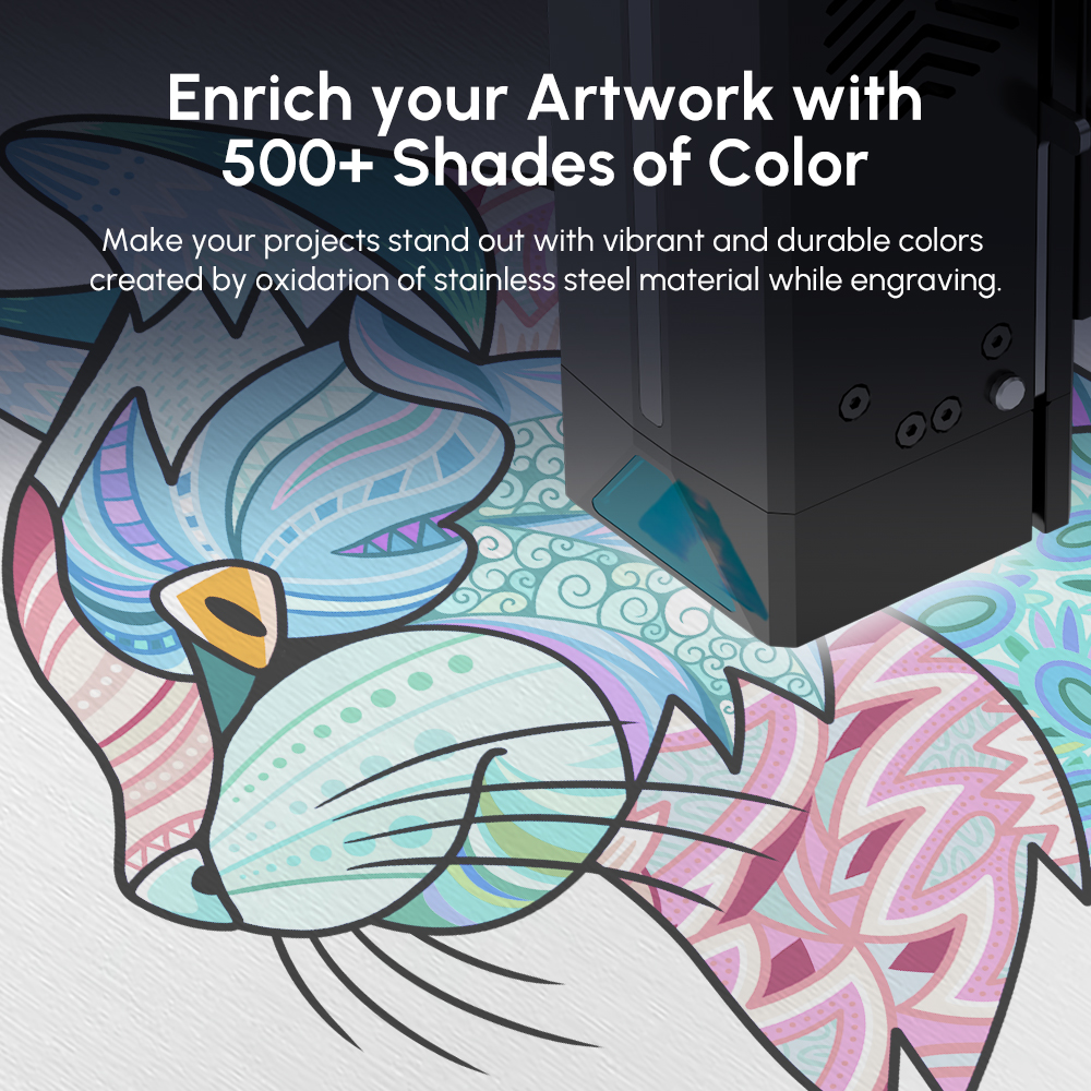 - Yli 500 värisävyä ruostumattoman teräksen anodisoinnilla kaiverruksen aikana