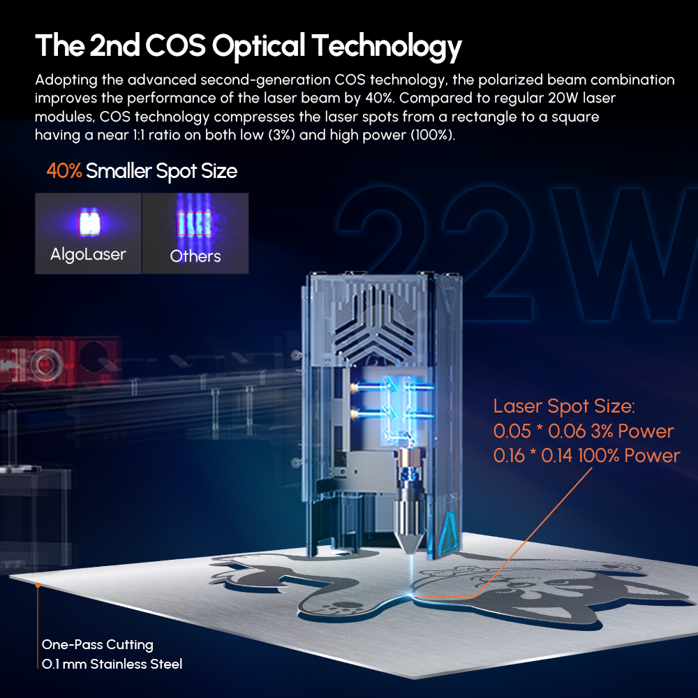 Toisen sukupolven COS-teknologia yhdistää polarisoidut säteet ja parantaa lasersäteen suorituskykyä 40 %. Verrattuna tavanomaisiin 20W-lasermoduuleihin COS-teknologia puristaa lasersäteen suorakulmiosta neliöksi, lähes 1:1-suhteeseen sekä matalalla (3 %) että korkealla (100 %) teholla.