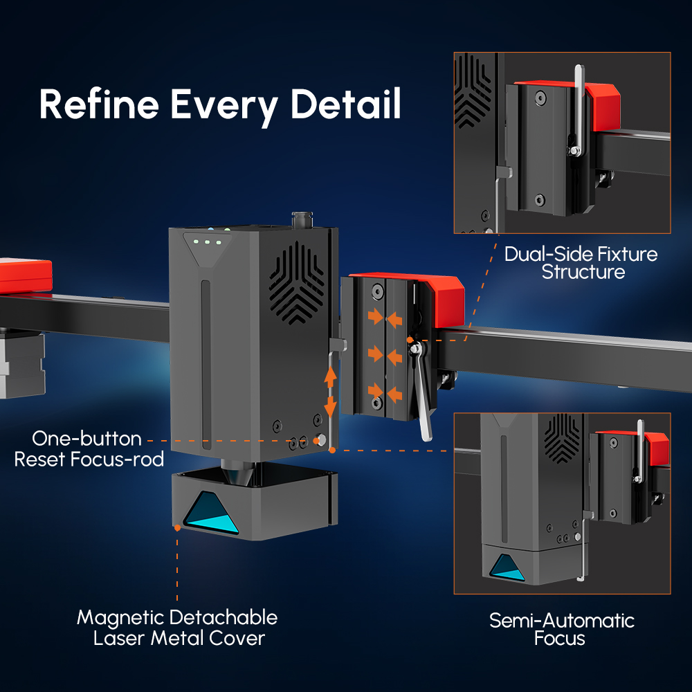 Magneettinen ja irrotettava laserin metallisuojus: helppo puhdistaa ja mahdollistaa syvemmän leikkaustarkennuksen ilman suojusta.