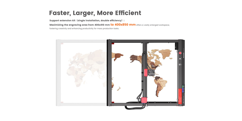 Laajennussarjalla kaiverrusalue kasvaa 400x410 mm koosta 400x850 mm kokoon. Suurempi työskentelyalue tukee monipuolisia projekteja ja yksityiskohtaisia kuvioita.