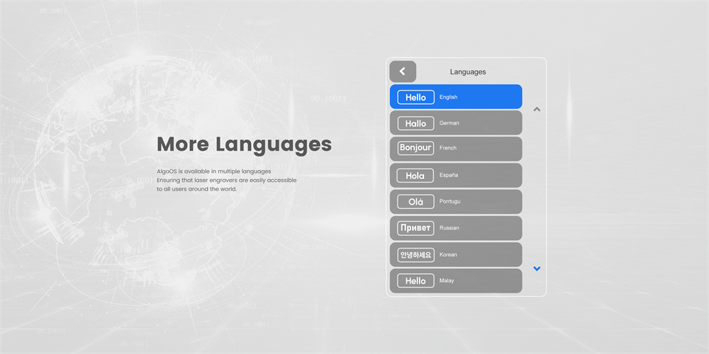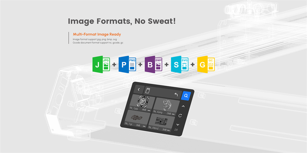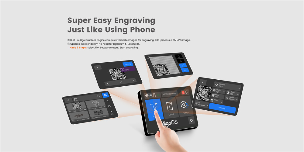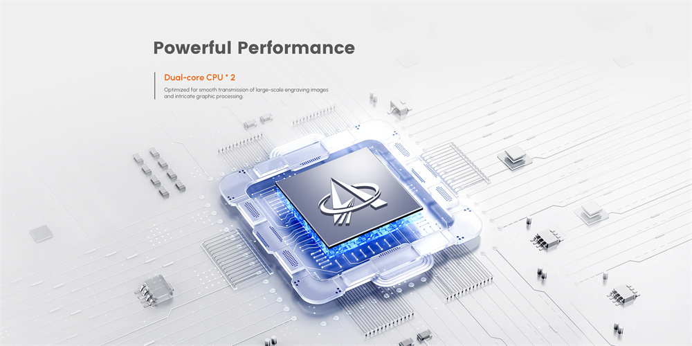 Älykäs kosketusnäyttö yksinkertaistaa kaiverrusprosessin: valitse tiedosto, aseta parametrit ja aloita kaiverrus kolmessa vaiheessa. Selkeä käyttöliittymä sopii sekä aloittelijoille että edistyneille, eikä vaadi monimutkaisia ohjelmistoasetuksia.