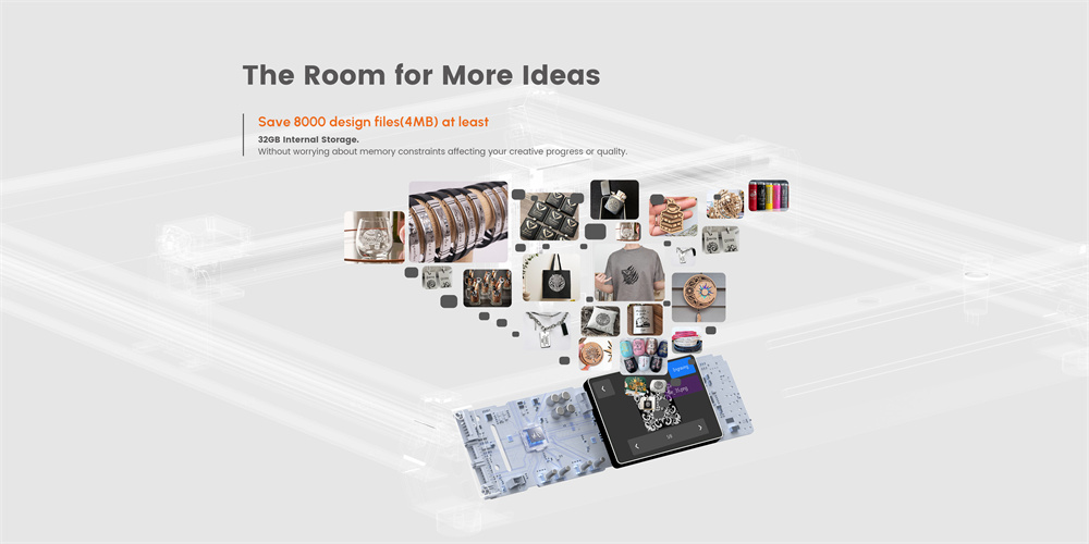 32GB sisäinen muisti riittää jopa 8000 suunnittelutiedostolle. Voit tallentaa ja käyttää laajaa mallikirjastoa ilman jatkuvaa tilan vapauttamista, mikä sujuvoittaa työnkulkua.