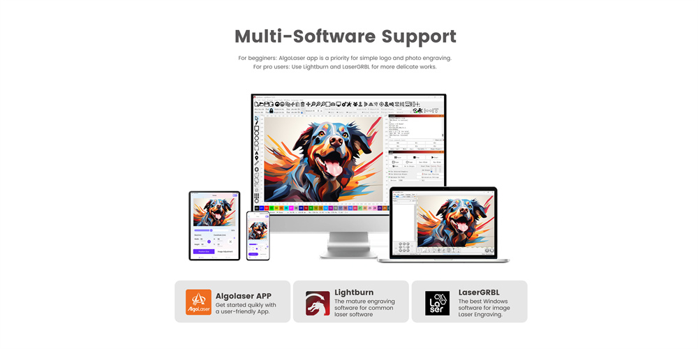 Yhteensopiva muun muassa AlgoLaser -sovelluksen, Lightburnin ja LaserGRBL:n kanssa. Voit käyttää haluamaasi suunnittelu- ja kaiverrusohjelmaa ja mukauttaa työnkulun omiin mieltymyksiisi.