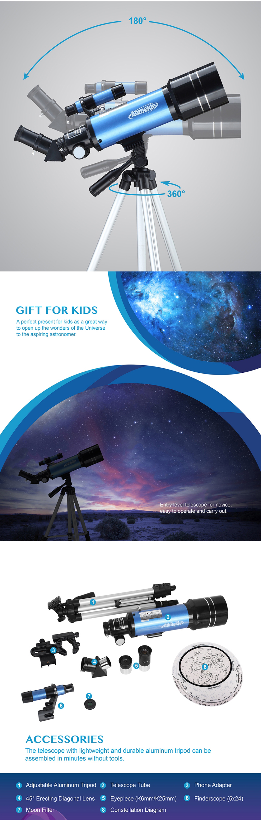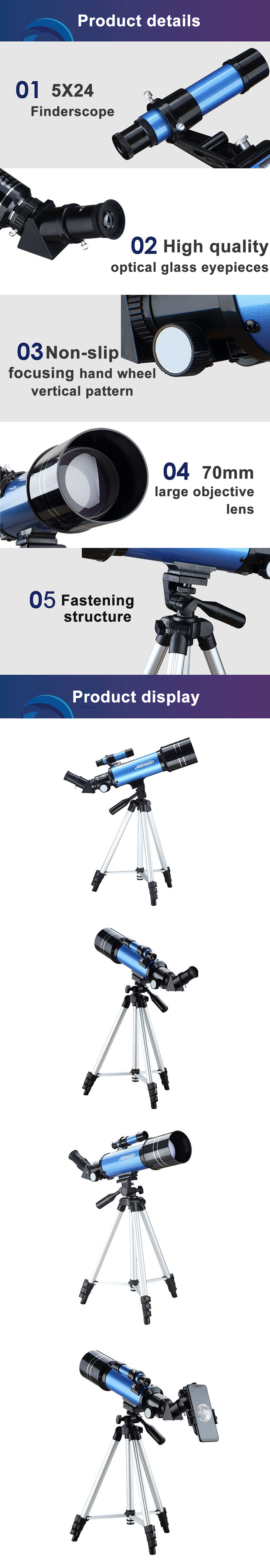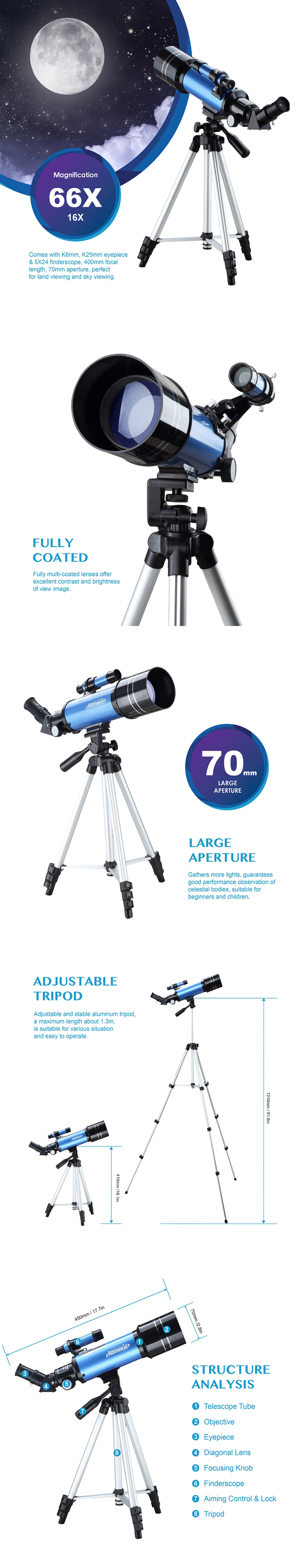 1. 70mm kaukoputki aikuisille ja lapsille: 400mm polttovälillä. Suuri suurennosalue ja vakaa kuvanlaatu. 70mm suuri objektiivi tuottaa kirkkaamman ja selkeämmän kuvan ja laajan näkökentän.
