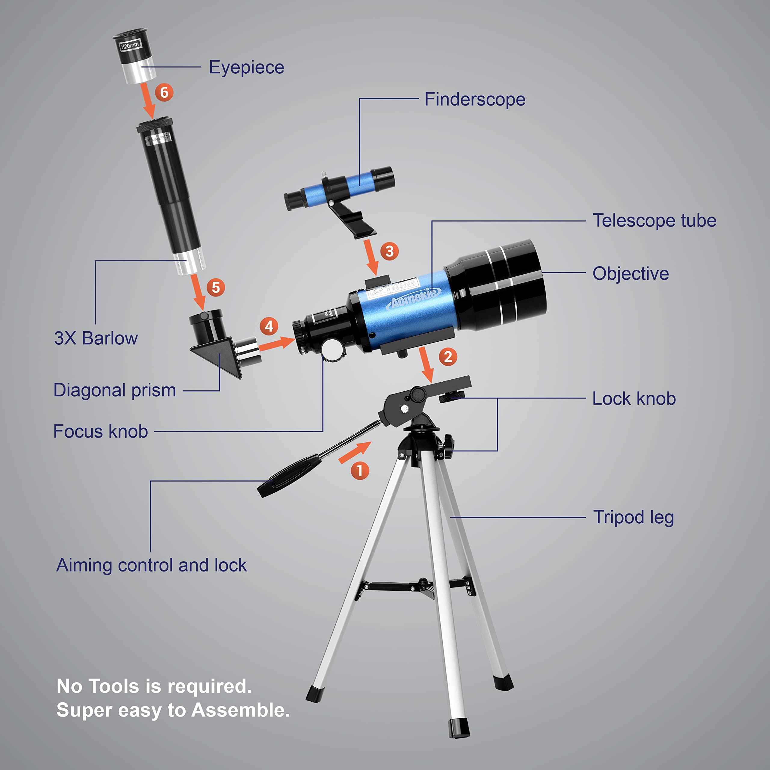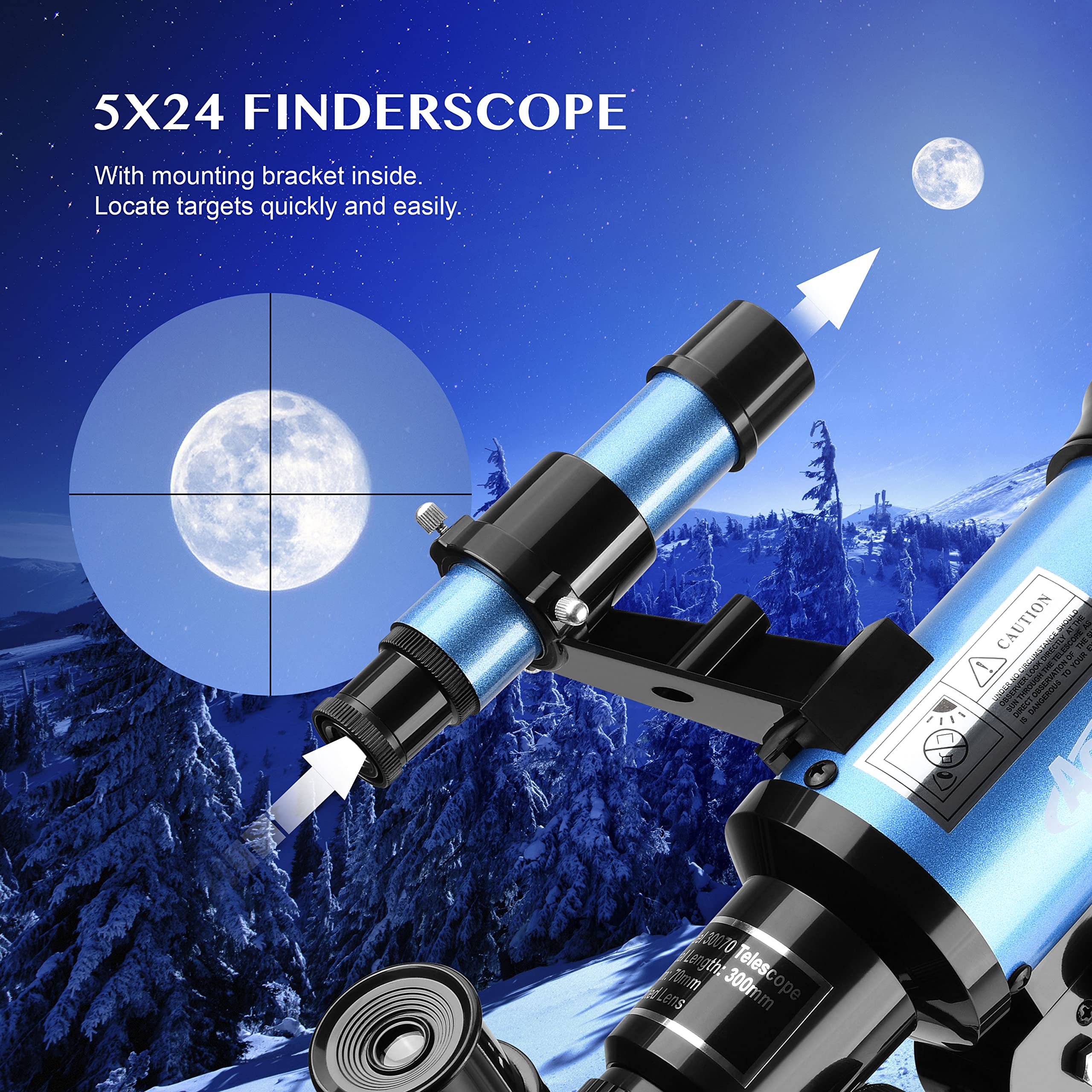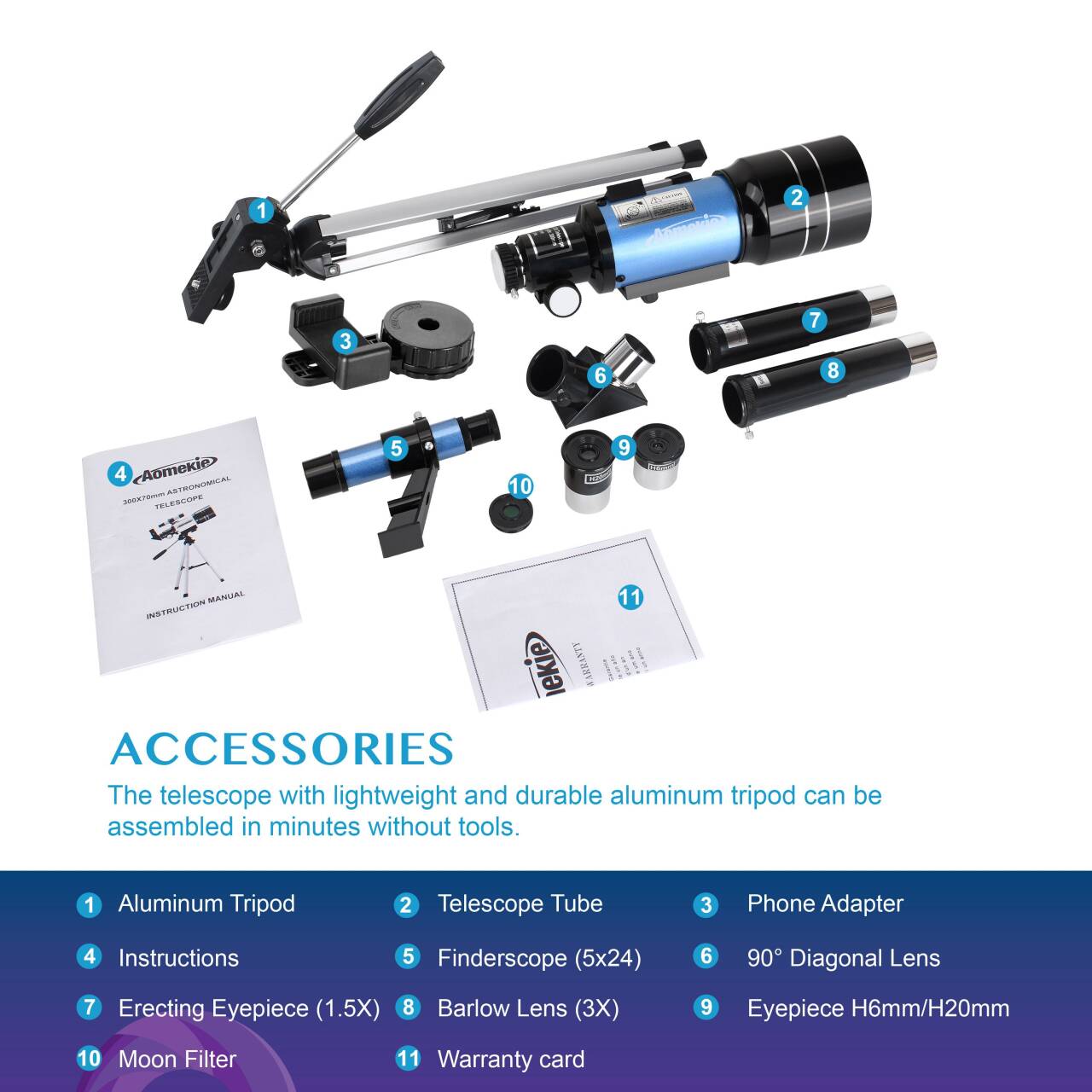 1. 70mm suuri aukko ja silmiä suojaava kuusuodatin. Valokuvaa ja jaa kaukainen maisema ystäville mukana tulevalla puhelinsovittimella.Pakkauksen sisältö: