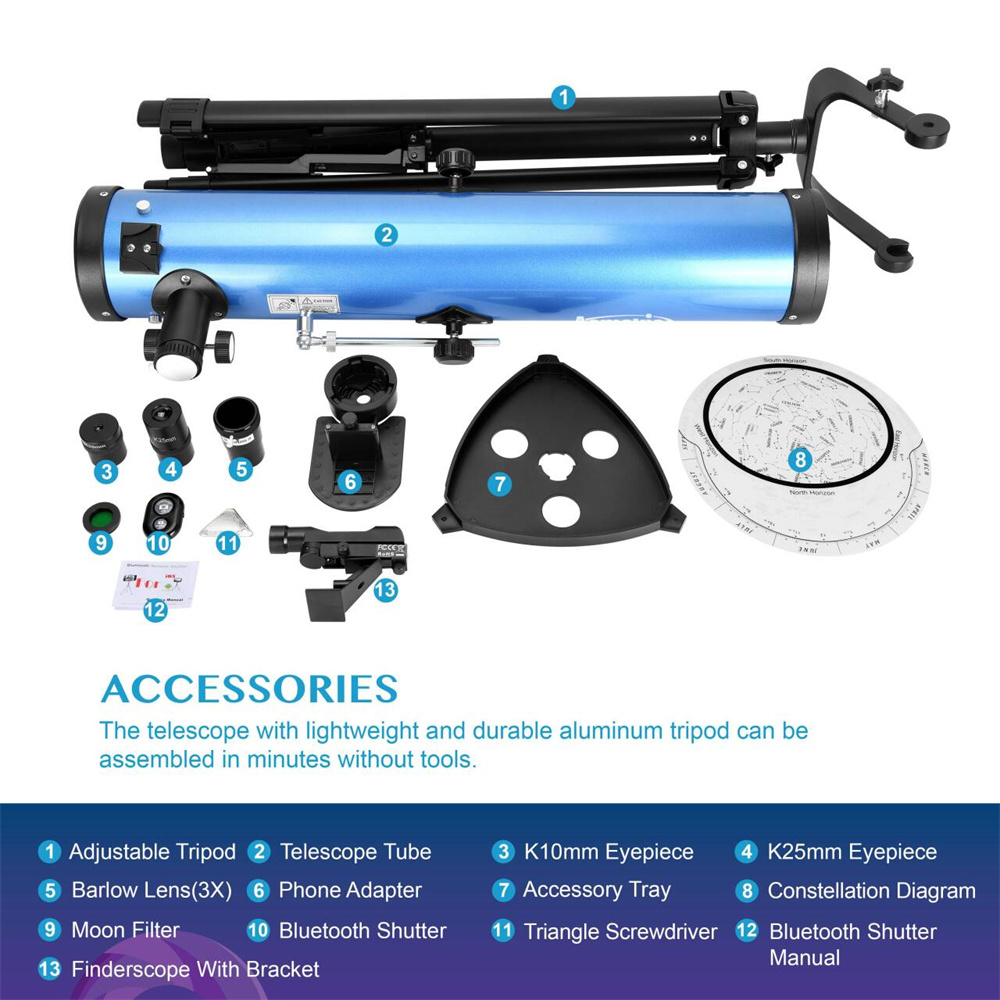 Monipuolinen AOMEKIE A02018 -heijastinkaukoputki sopii sekä aloittelijoille että harrastajille, jotka haluavat tarkastella Kuuta, planeettoja ja syvän taivaan kohteita vakaalla jalustalla ja käytännöllisillä lisävarusteilla, kuten puhelinpidikkeellä ja Bluetooth-kaukolaukaisimella.