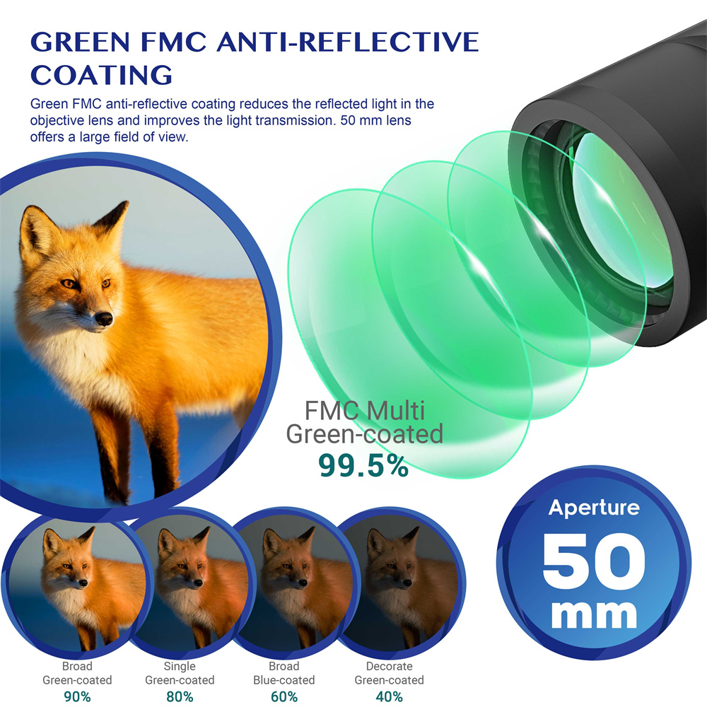 - 7X suurennos ja 50mm objektiivilinssi selkeään ja kirkkaaseen kuvaan
