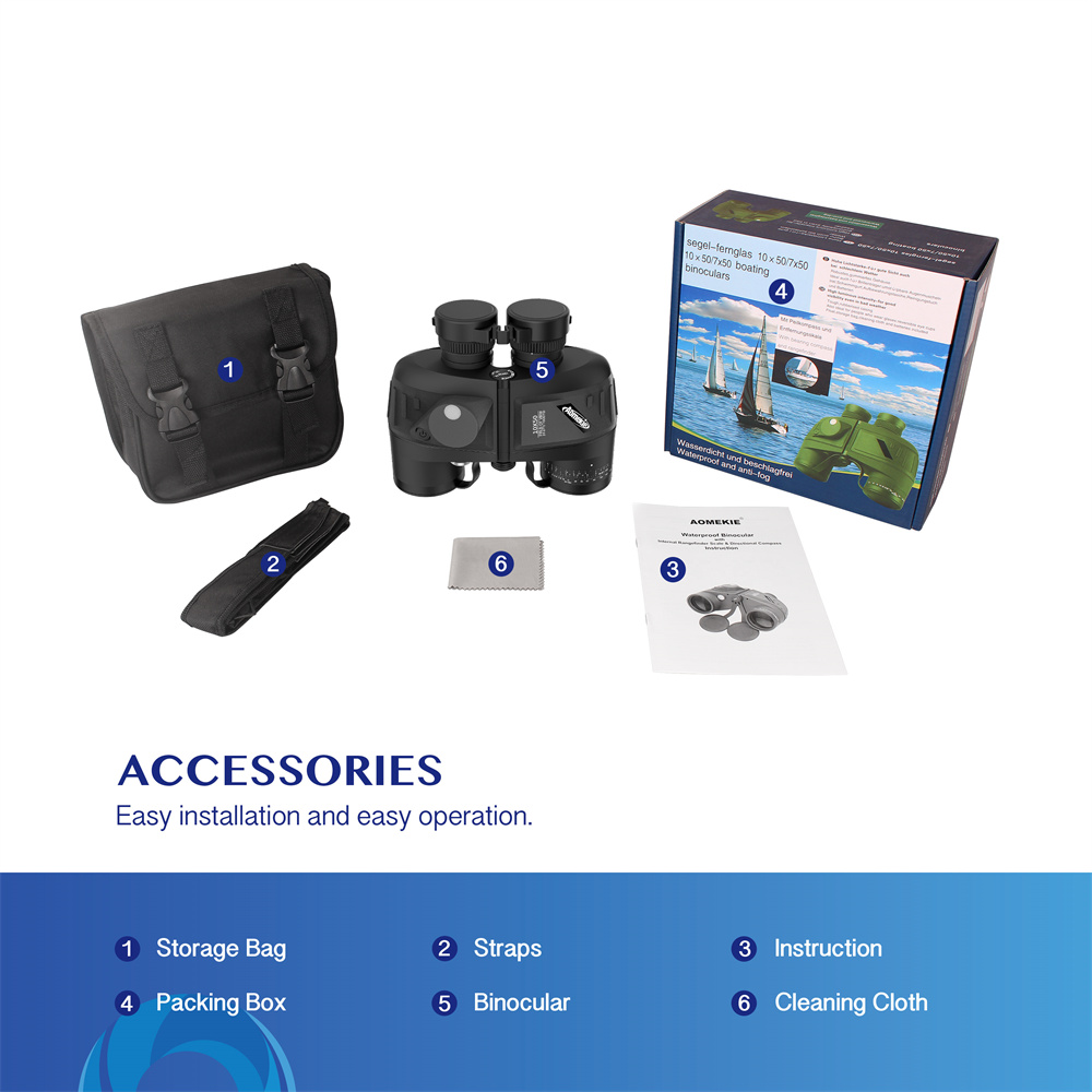 AOMEKIE AO3002 -kiikarit on suunniteltu erityisesti veneilyyn, retkeilyyn ja muuhun ulkokäyttöön. 7X suurennos, 50mm objektiivilinssi, sisäinen etäisyysasteikko ja valaistu kompassi auttavat hahmottamaan kohteet ja suunnan myös hämärässä ja haastavissa olosuhteissa.