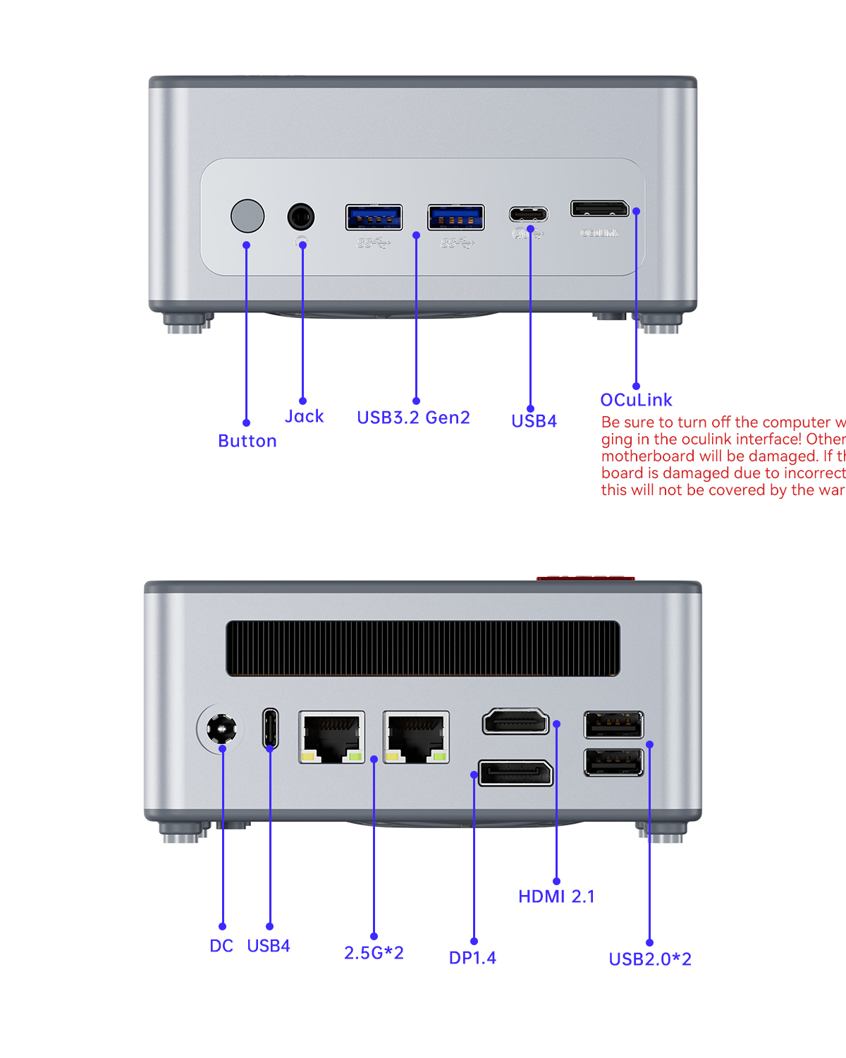 2 x USB3.2 2 x USB2.0 2 x USB4 2 x RJ45 1 x Oculink 1 x HD2.1 1 x DP-portti 1 x 3.5mm standardi kuulokeliitäntä |