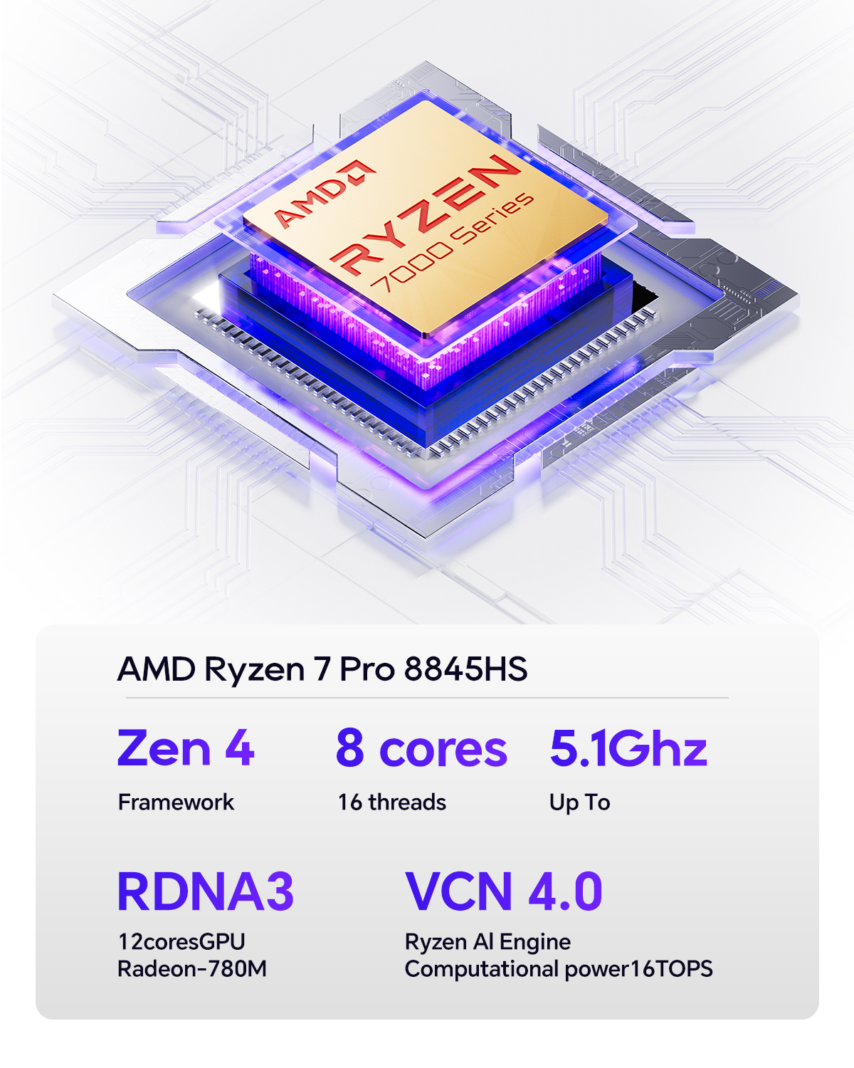 - AMD Ryzen 7 PRO 8845HS, Octa-Core 3.8GHz (jopa 5.1GHz) – energiatehokas ja suorituskykyinen alusta.