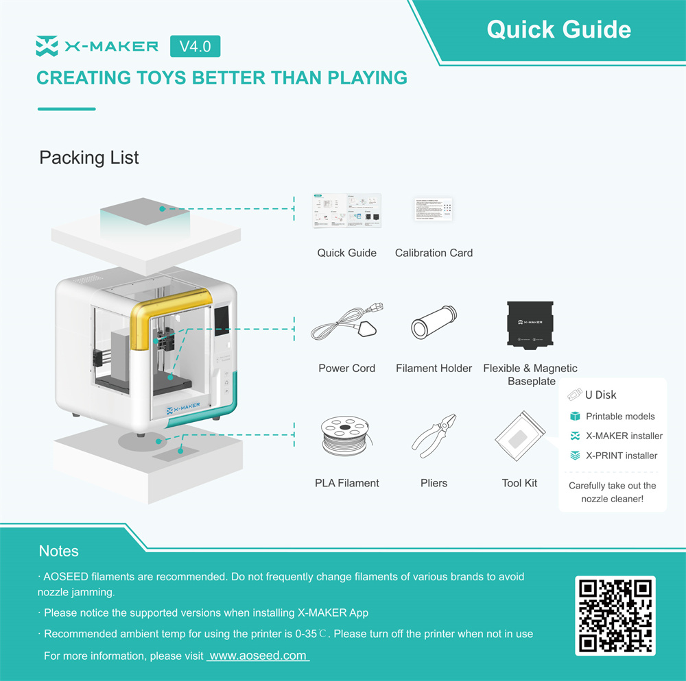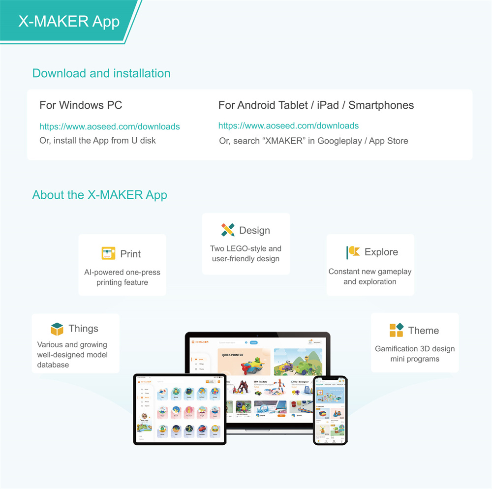 AOSEED X-MAKER on lapsille suunnattu kompakti 3D-tulostin, joka yhdistää turvallisen suljetun rakenteen, hiljaisen käytön ja helpon ohjauksen. Se sopii sekä kotiin että luokkahuoneeseen luovan tekemisen tueksi.