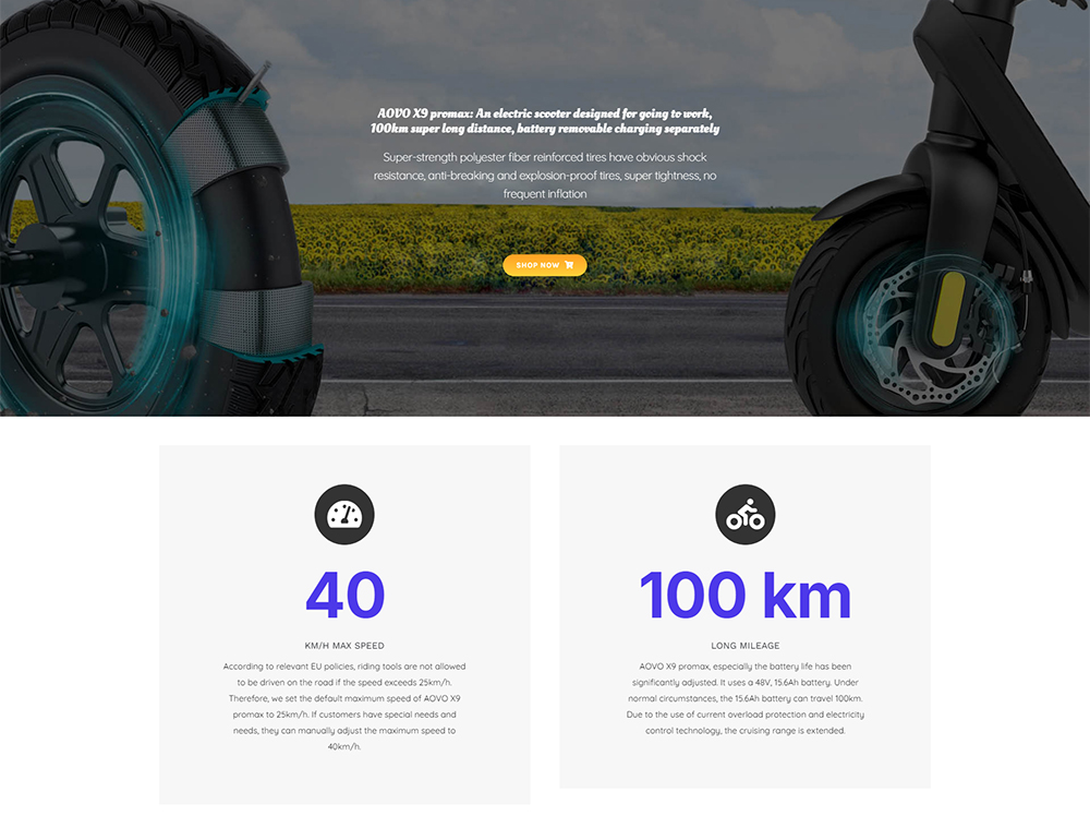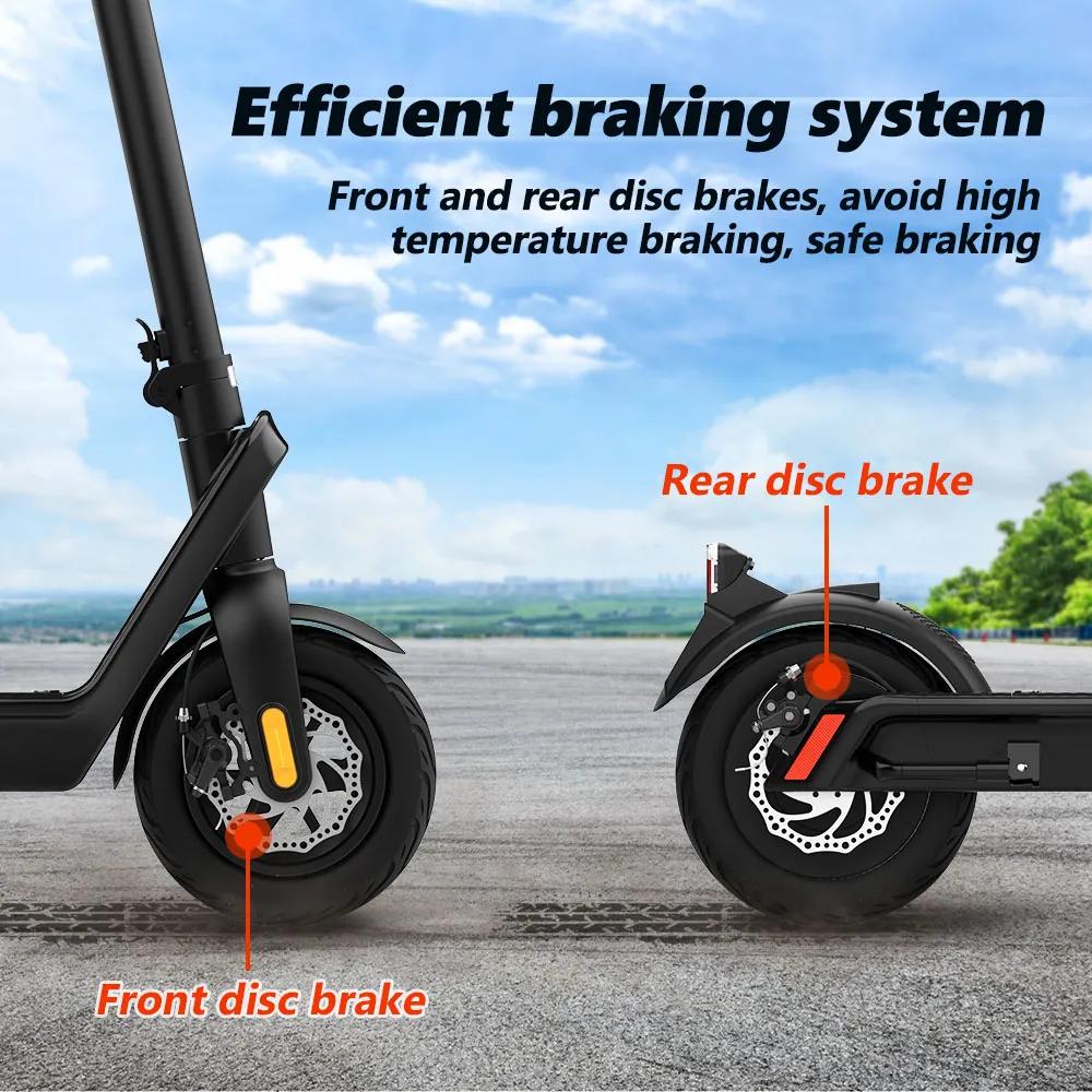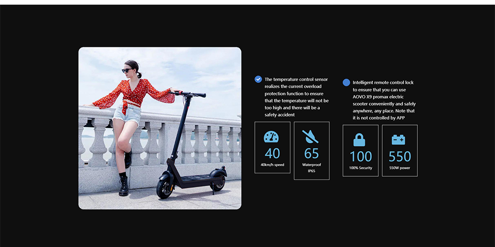 AOVO X9 PROMAX on vankkarakenteinen sähköpotkulauta päivittäiseen liikkumiseen. 48V 550W harjaton moottori ja 10-tuumaiset puhkeamista ehkäisevät tyhjiörenkaat tarjoavat vakaan ajokokemuksen. Irrotettava 48V 15.6Ah litiumakku mahdollistaa pitkän, 80–100KM toimintasäteen. Etu- ja takalevyjarrut parantavat hallittavuutta, ja IP54-suojaus auttaa kestämään roiskeita.