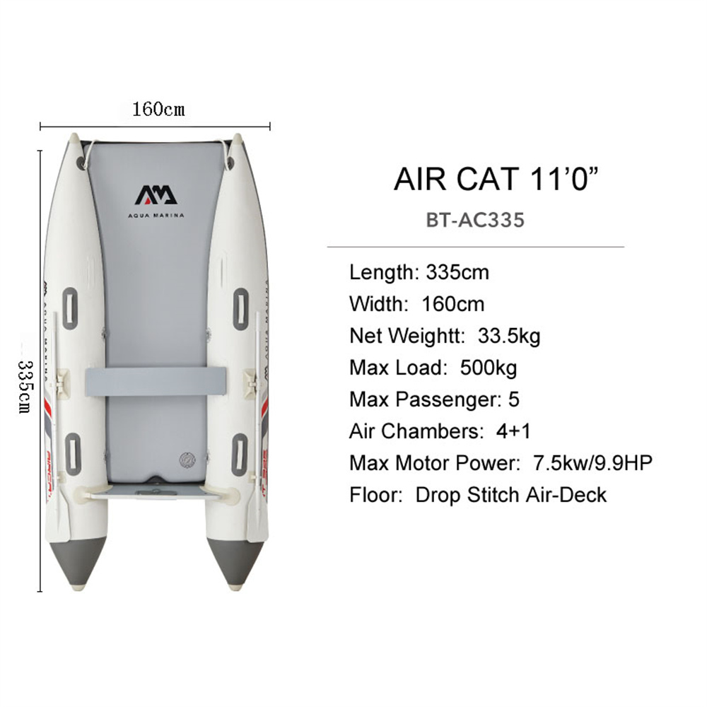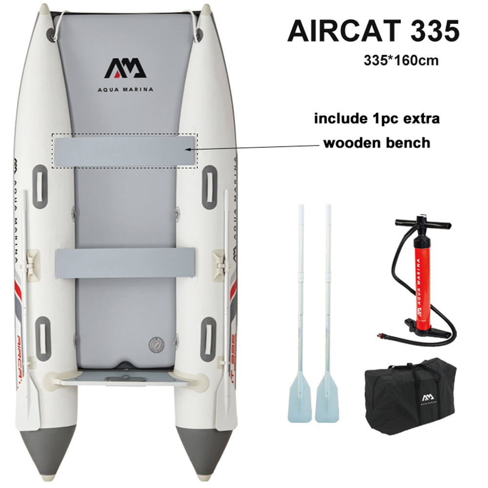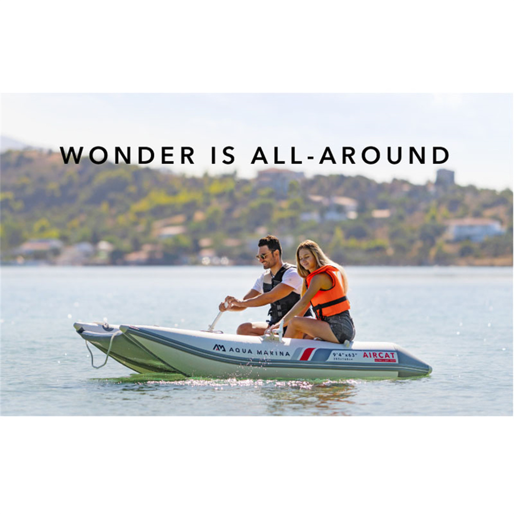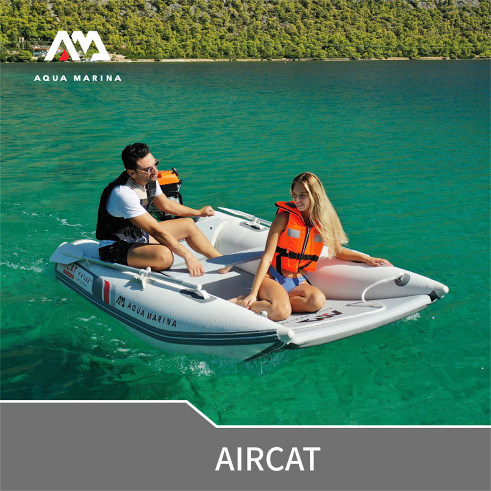 AQUA MARINA AIRCAT on tilava ja erittäin vakaa ilmatäytteinen katamaraani, joka sopii jopa 5 hengen retkille, kalastukseen, sukellukseen ja vesillä liikkumiseen. Tunnelirunko ja leveä kansi tarjoavat hyvän tasapainon, ja vene kestää hyvin aallokkoa ja tuulta pysyen silti ketteränä ja nopeana. Avoin keularakenne tarjoaa mukavan tilan seisomiseen, lepäämiseen tai varusteiden käsittelyyn.