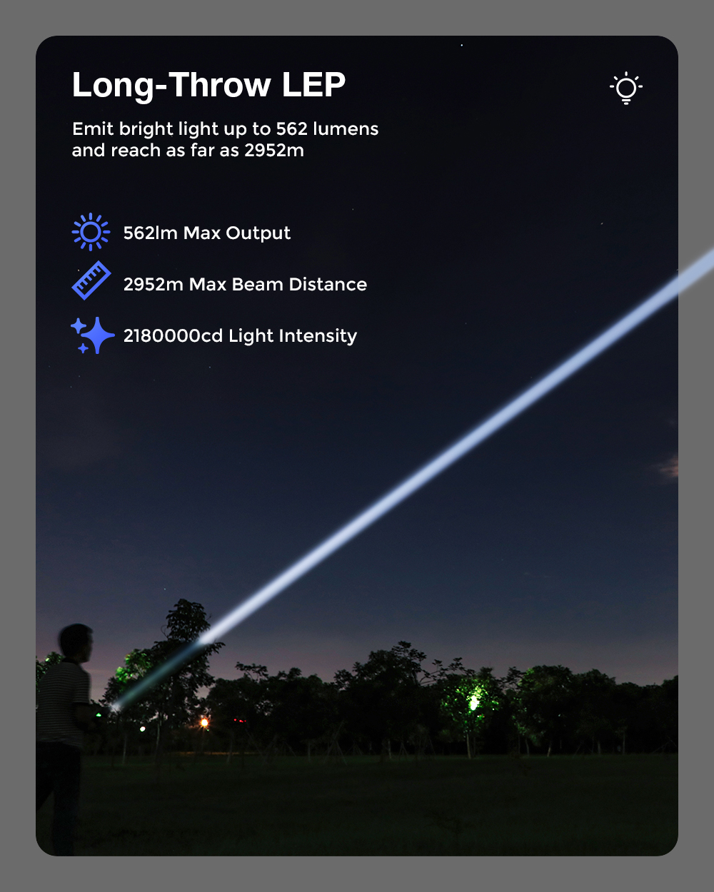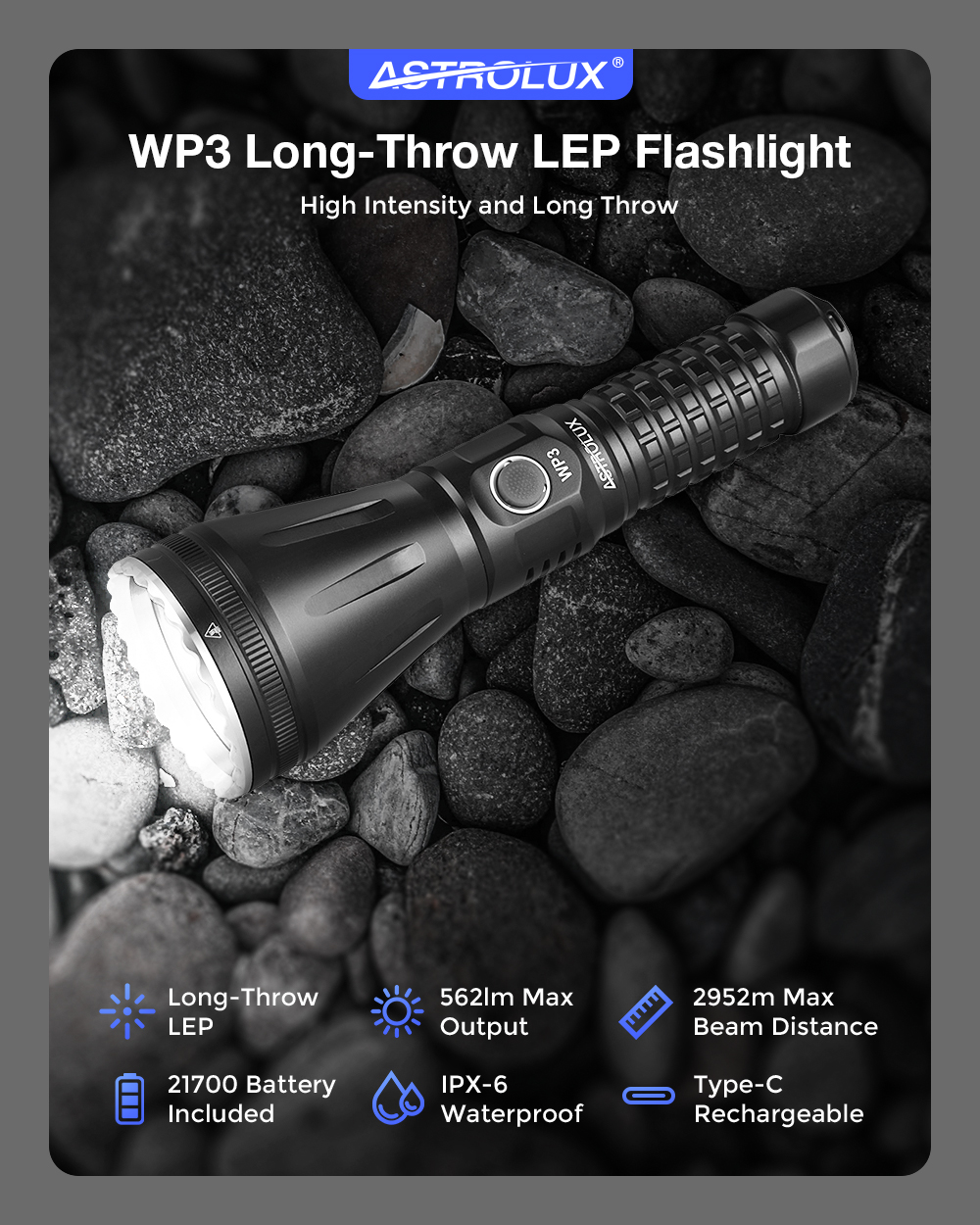 Astrolux® WP3 LEP -valonlähde tuottaa korkean energiatiheyden ja muodostaa erikoislinssin heijastusjärjestelmän avulla kapean, pitkälle kantavan valokolumnin. Korkean ja matalan kirkkauden tilat ovat säädettävissä, käyttö on yksinkertaista ja käytännöllistä. WP3 LEP -etsintävalon kantama on jopa 2.9 kilometriä. Valovirta on 562 lumenia ja valovoima 2,180,000 cd. Mukana tulee yksi 21700-uudelleenladattava litiumioniakku. Laadukas ajopiiri sisältää lämpötilanhallinnan ja vakiovirtaohjauksen, joka estää taskulampun ylikuumenemisen. Suunniteltu vaativaan erikoisvalaistukseen.