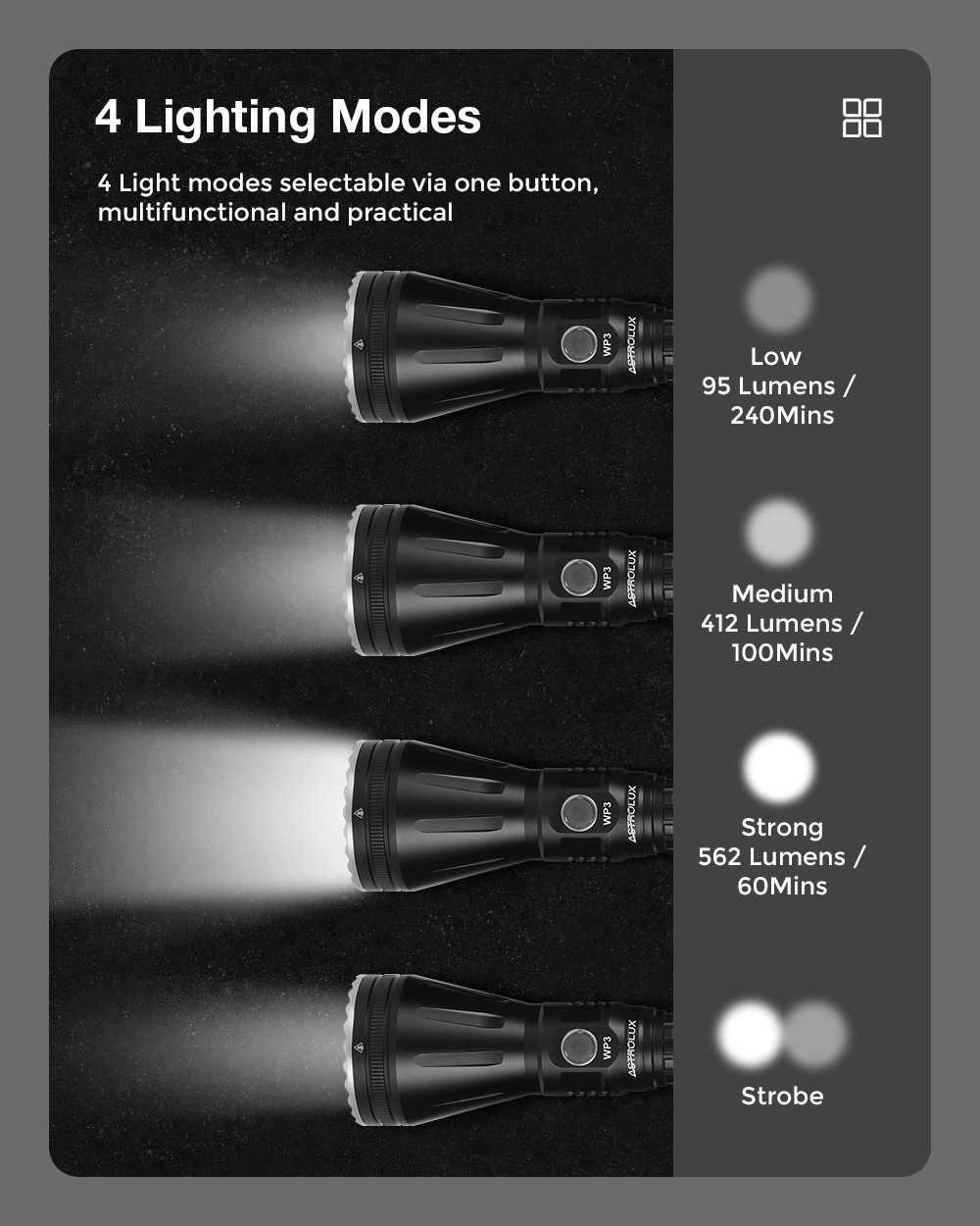 | Käyttöliittymä | Yksi painallus: korkea (80 %) – matala (20 %) Tuplapainallus: turbo (100 %) Kolmipainallus: strobo Pitkä painallus: pois |