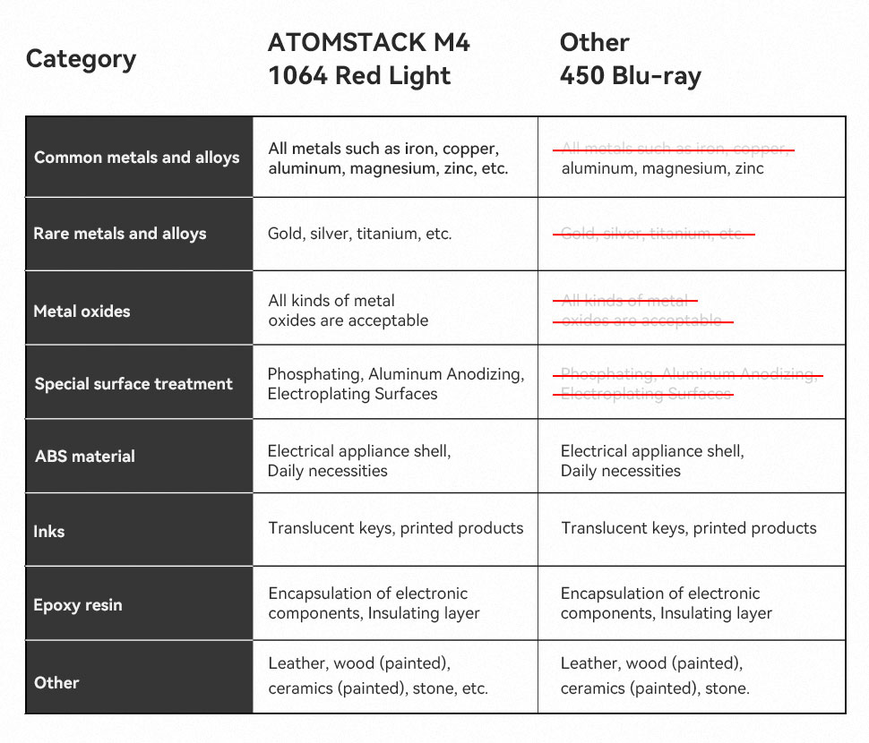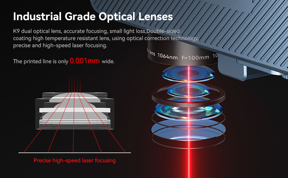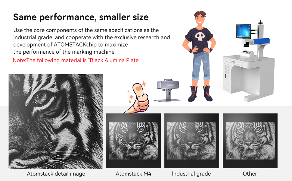 Atomstack M4 käyttää 1064nm infrapunakuitulaseria, joka tarjoaa erinomaisen etsauskyvyn. Kaiverrusnopeus on 720,000 mm/min ja kaiverrustarkkuus jopa 0.001 mm, mikä tekee siitä todellisen suunnannäyttäjän kannettavien laserkaiverruskoneiden joukossa.