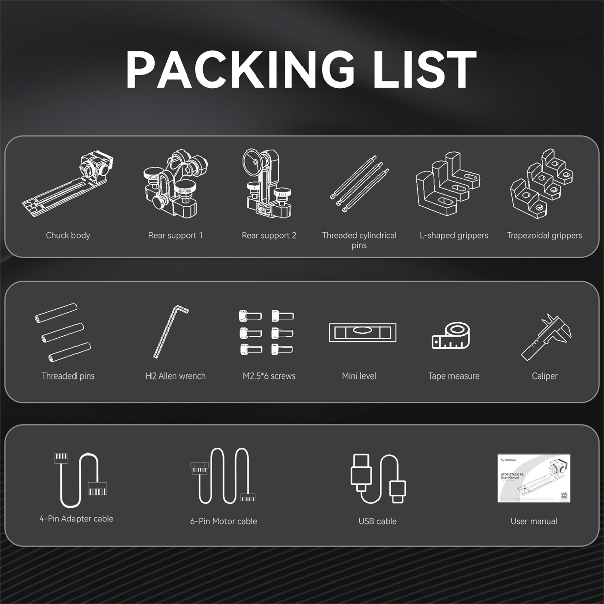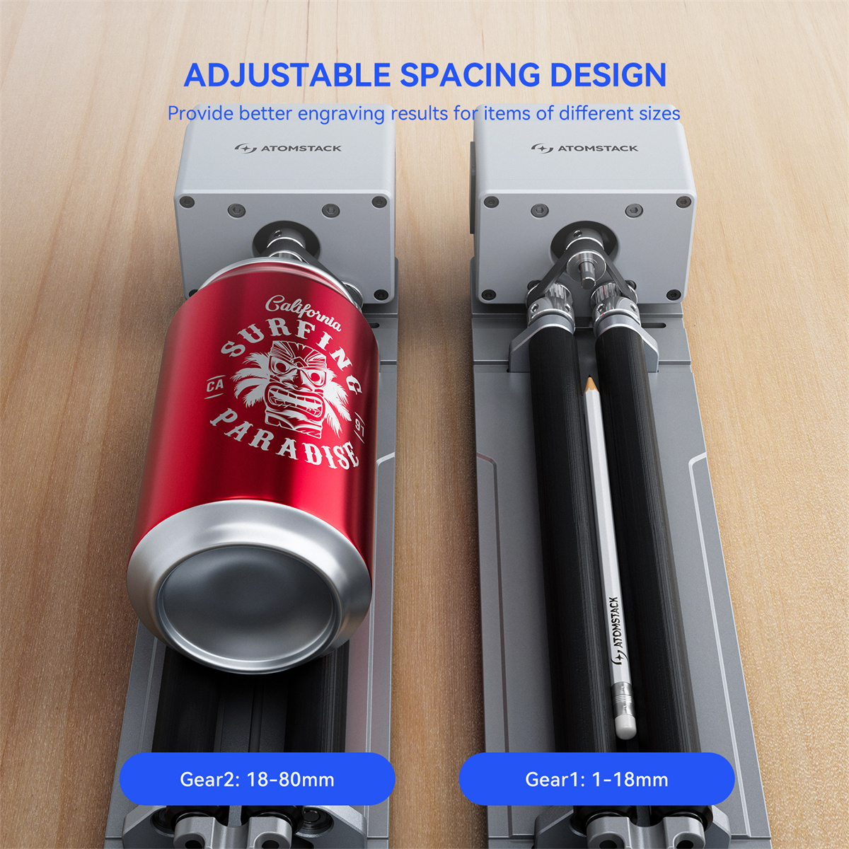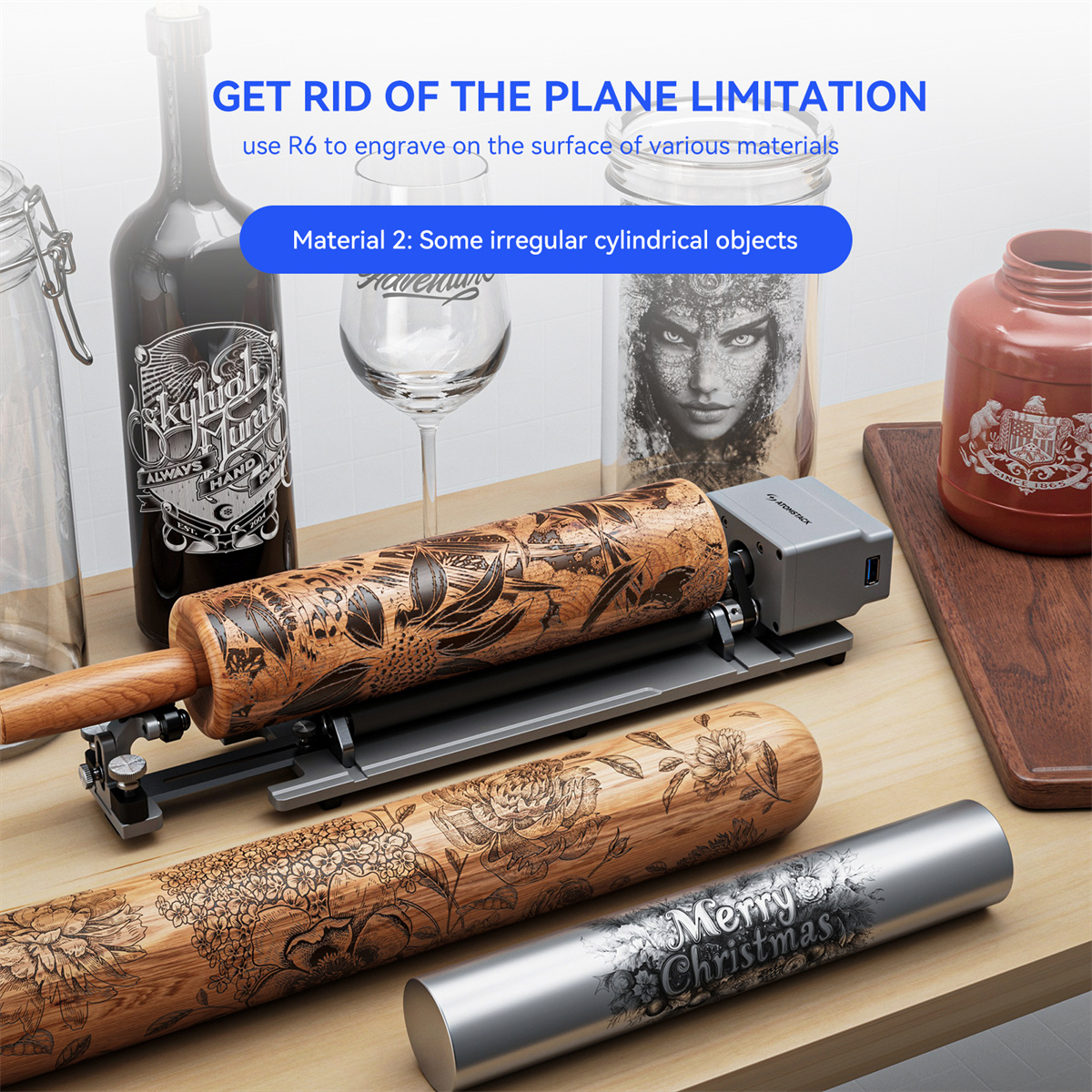 ATOMSTACK R6 3D Laser Engraver Rotary Roller Axis ja R8 Rotary Roller Attachment laajentavat laserkaiverruksen tasopinnoilta sylinterimäisiin, pallomaisiin ja rengasmaisiiin kohteisiin. Älykäs tunnistus, tukeva rakenne ja laaja yhteensopivuus tekevät käyttöönotosta sujuvaa ja työnjäljestä tasaista.