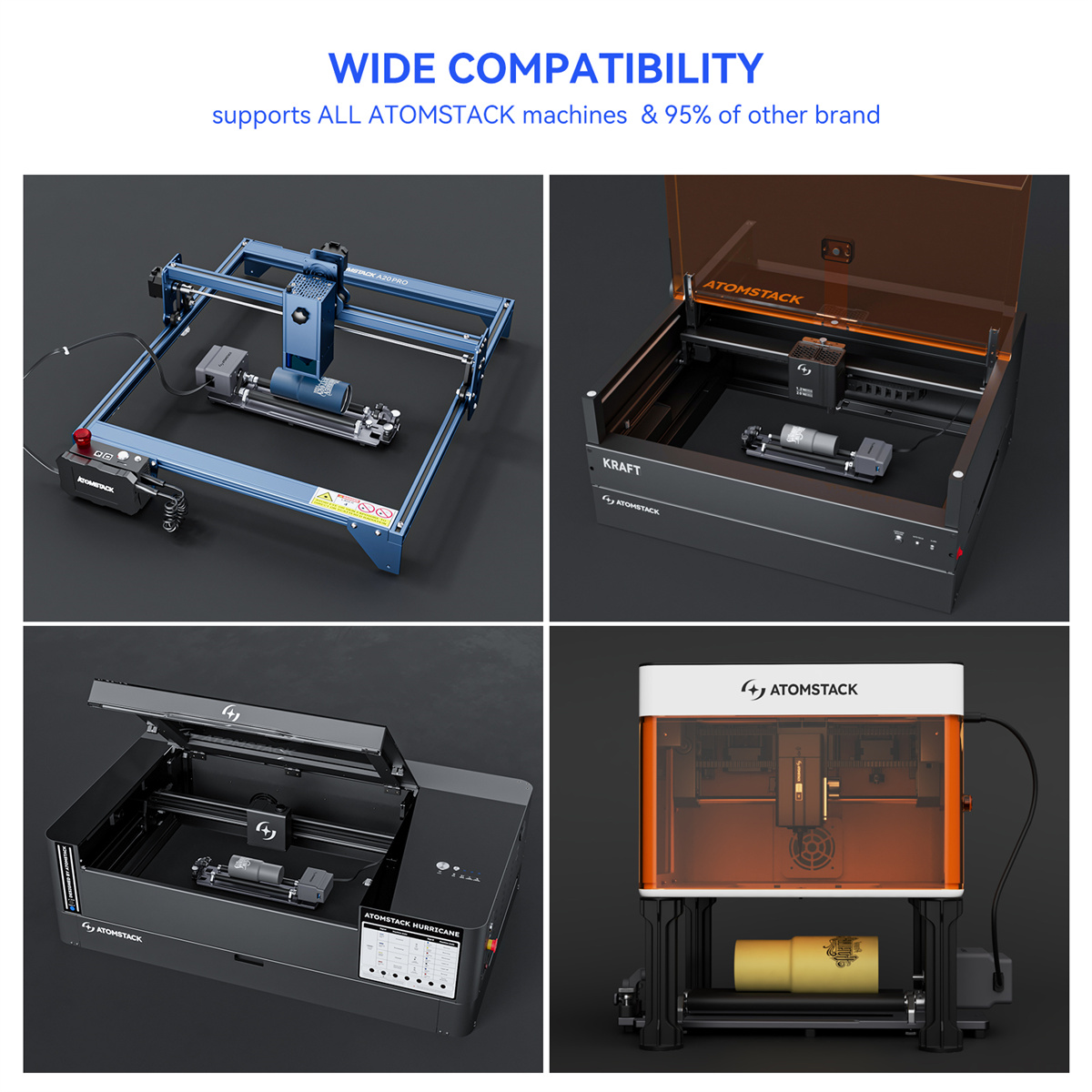 - Laaja yhteensopivuus: kaikki AtomStack-laitteet ja 95% markkinoilla olevista puolijohdelaserkaivertimista