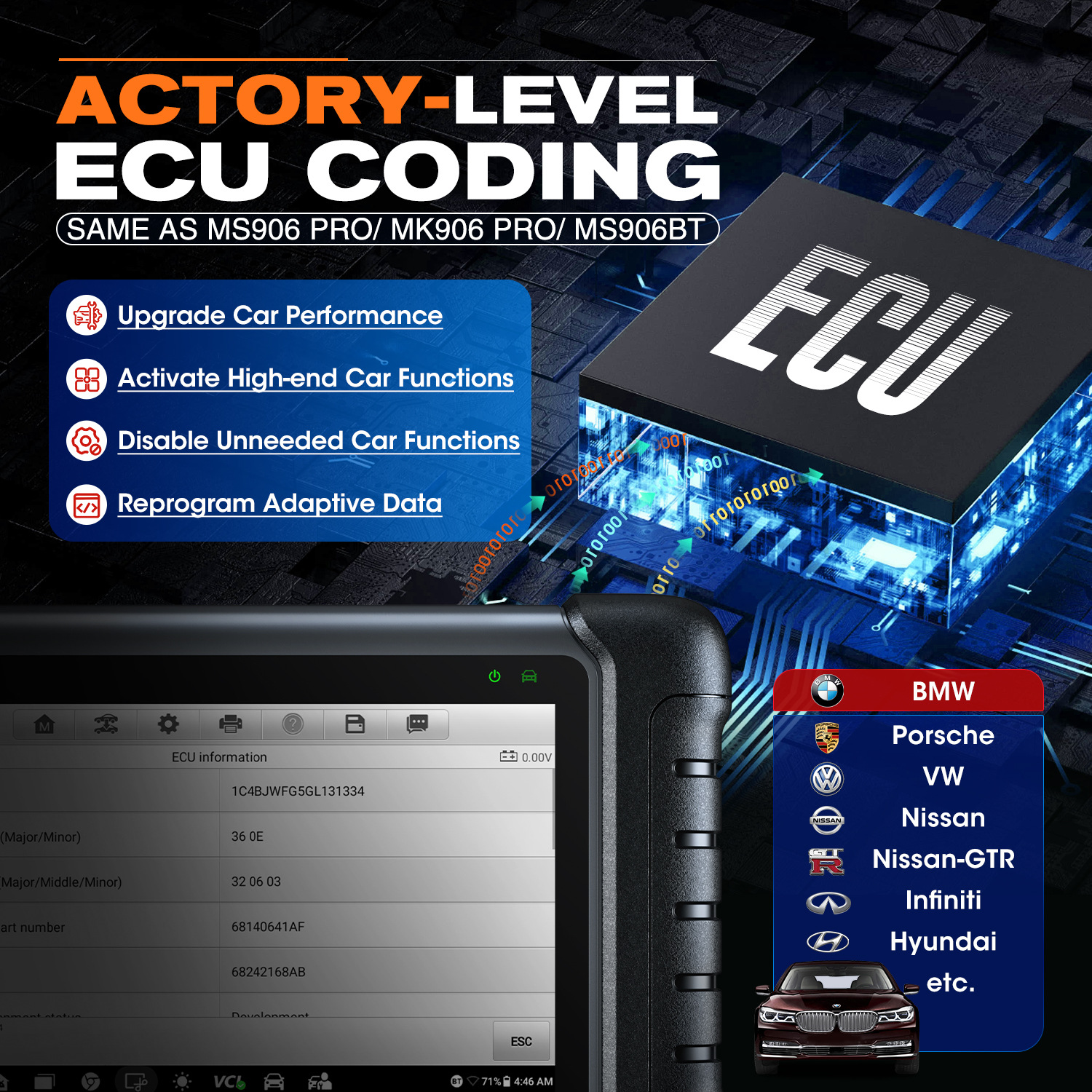 [Edistynyt ECU-koodaus, sama kuin MS906 PRO/ MS906BT] Autel-skanneri DS808S-BT tarjoaa saman ECU-koodauksen kuin MS906PRO, MP900BT, MP808S. Voit muokata tehdasasetuksia ajoneuvon varustelun parantamiseksi, lisätä moottorin suorituskykyä moottoriohjelmaa hallitsemalla sekä avata piilotettuja toimintoja (esim. Volkswagen, Audi, Mercedes-Benz, BMW, Skoda).