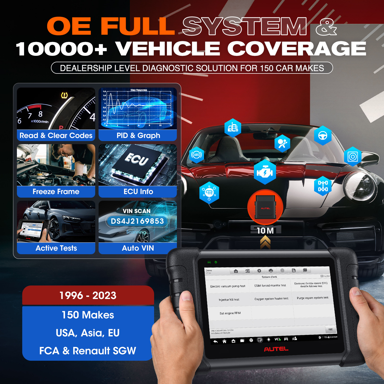 [OE-tason koko järjestelmän diagnostiikka, FCA-autentikointi] Android 11.0 -järjestelmällä DS808S-BT tarjoaa nopean diagnoosin. OE-tason toiminnot kaikille järjestelmille: vikakoodien luku/poisto, livedata ja sen graafit, tallennus ja toisto, tiedonhaku, erikoisnollaukset. Kattaa yli 160 merkkiä, 15,000 autoa sekä FCA-ajoneuvot. Autel tekee yhteistyötä FCA-ryhmän kanssa, mikä mahdollistaa FCA-portin ohituksen ja koko prosessin diagnoosista koodaukseen Chrysler, Jeep, Dodge, Fiat ja muiden 2017 ja uudemmien mallien kanssa.