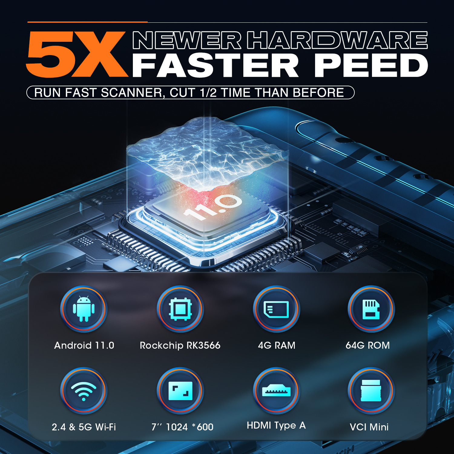 3. Tehokas laitteisto: Rockchip RK3566 -neliydinsuoritin, Android 11.0, 4+64GB muisti, kaksois-Wi‑Fi, diagnoosi jopa 5 kertaa aiempaa nopeampi.