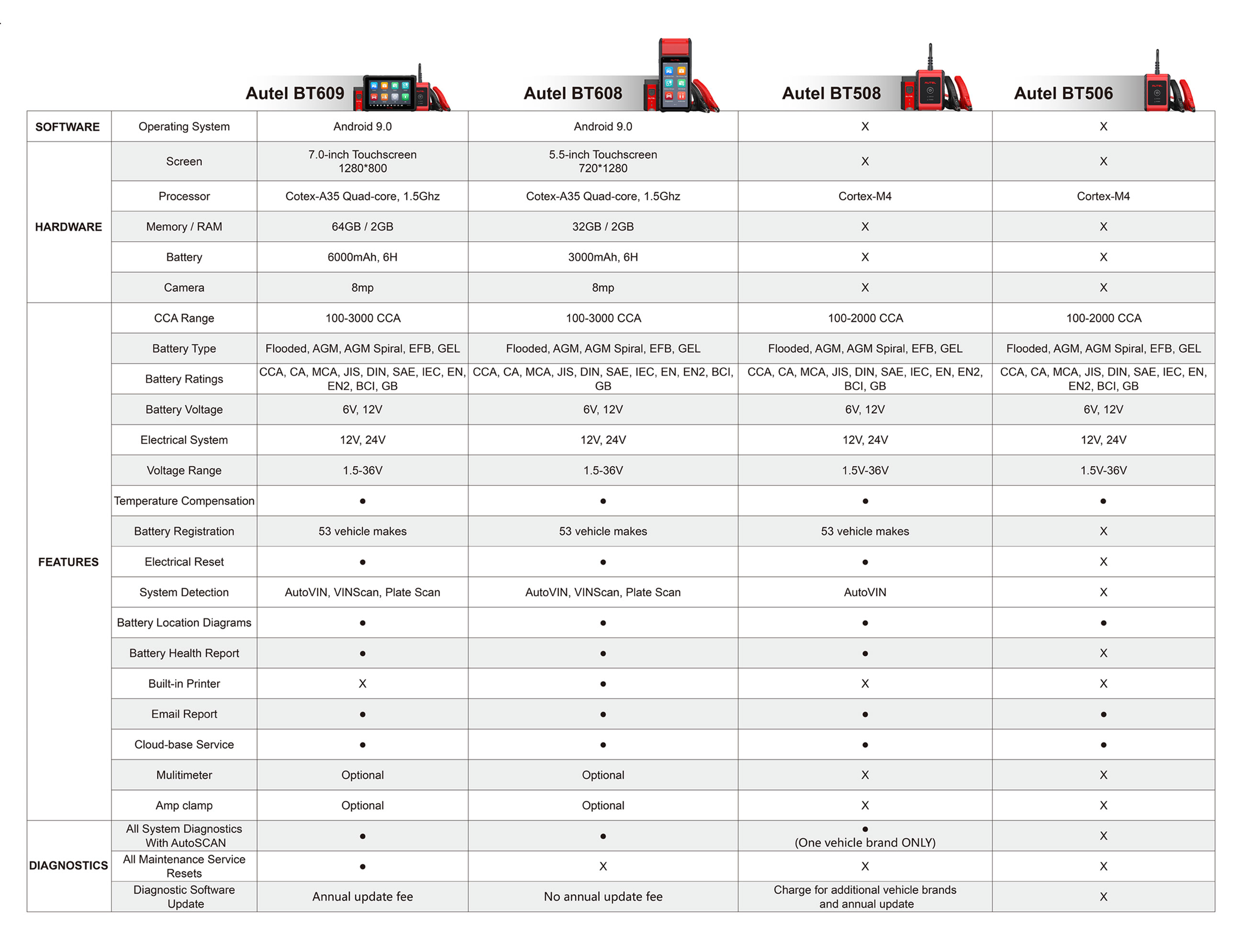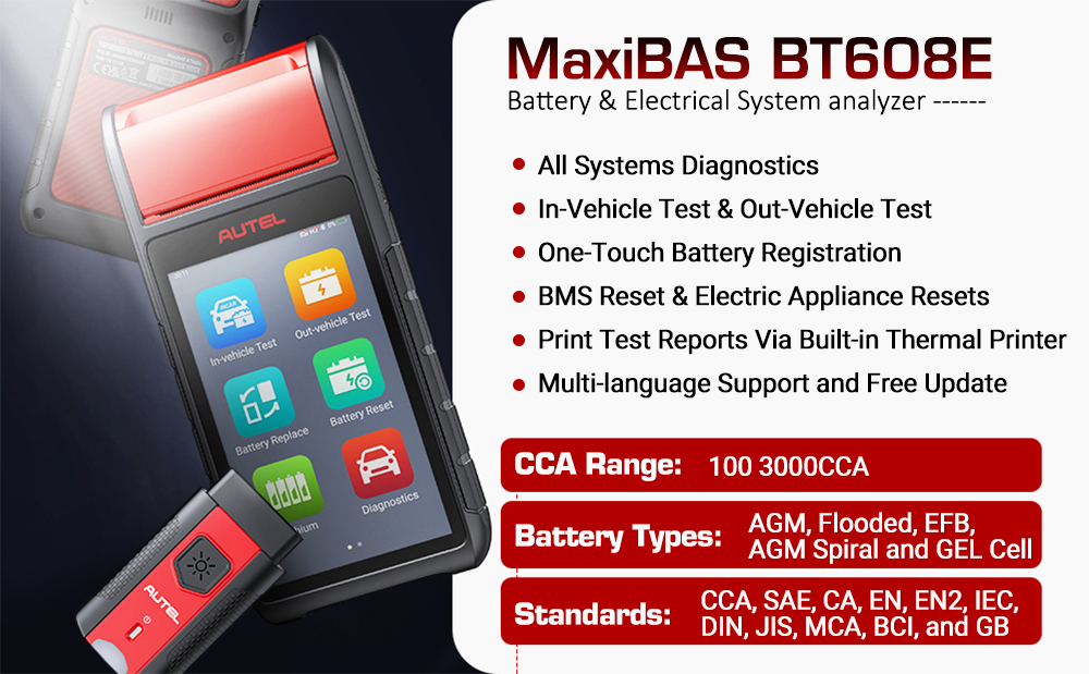 1. BT608E on kosketusnäytöllinen akun ja sähköjärjestelmän analysaattori, joka käyttää Adaptive Conductance -menetelmää. Se tarjoaa tarkan arvion akun kylmäkäynnistyskyvystä ja varakapasiteetista, jotka ovat olennaisia akun todellisen kunnon määrittämisessä.