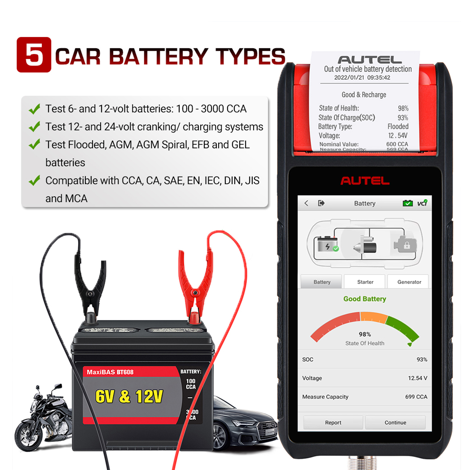 Autel MaxiBAS BT608E akkutesteri diagnostiikkatyökalu akkujen rekisteröinti 12V 24V 100–3000 CCA
