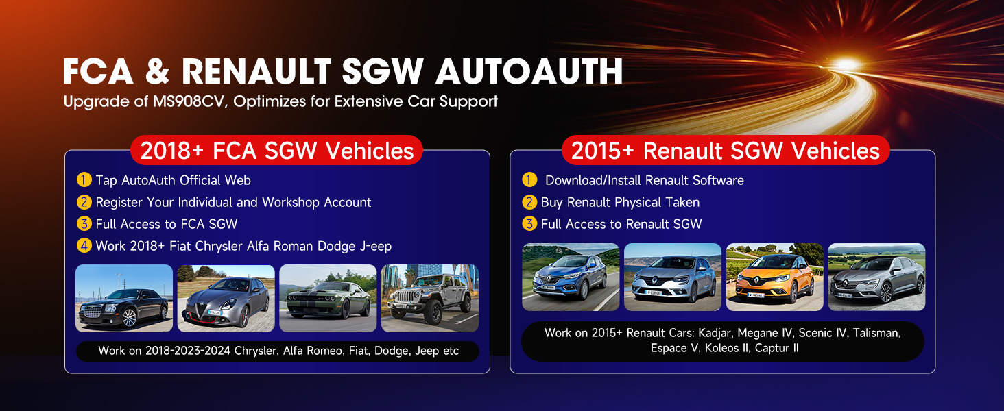 FCA AutoAuth pääsy 2018 ja uudempiin FCA-autoihin (for Chrysler, for Jeep, for Dodge, for Fiat jne.), BT506-akututkiin tuki ja MV108-digitaalinen tarkastus. Pilviraportit mahdollistavat raporttien lataamisen ja jakamisen sähköpostilla/SMS:llä/QR-koodilla.