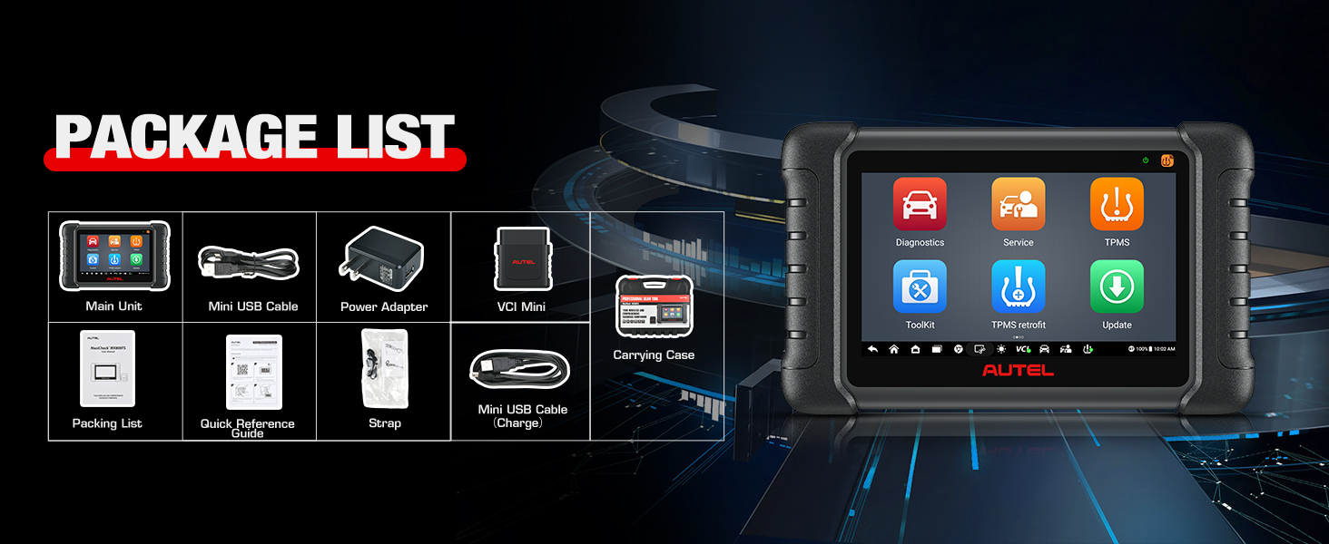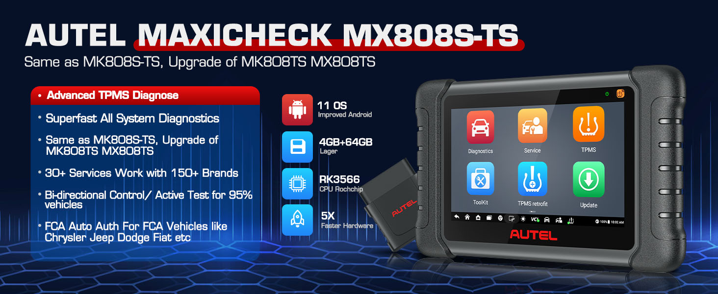 Autel MaxiCheck MX808STS on päivitetty versio malleista MK808/MX808/MK808BT ja vastaa mallia MK808STS. Se tarjoaa kattavat diagnostiikka- ja TPMS-toiminnot kohtuulliseen hintaan: edistynyt TPMS (rengaspainevalvonta), kaksisuuntainen ohjaus (aktiivinen testi), 38+ huoltotoimintoa, langaton koko järjestelmän diagnostiikka sekä muita monitoimisia ominaisuuksia. Vuonna 2024 mukaan on lisätty laajennuksia: FCA AutoAuth 2018+ FCA-autoille (for Chrysler, for Dodge, for Jeep, for Alfa Romeo ja for Fiat), Autel Cloud Report, tarkastuskameratuki (yhteensopiva Autel MV108/MV105) ja akkutesti (BT506).