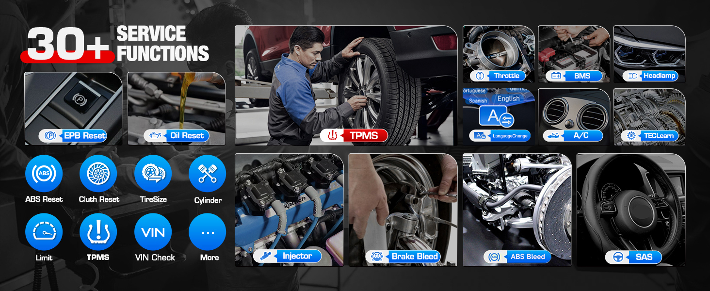 Yleisimmät huollot onnistuvat laitteella, mikä vähentää erillisiä käyntejä. Toimintojen saatavuus riippuu ajoneuvosta, tarkista yhteensopivuus lähettämällä VIN osoitteeseen autelchoice@outlook.