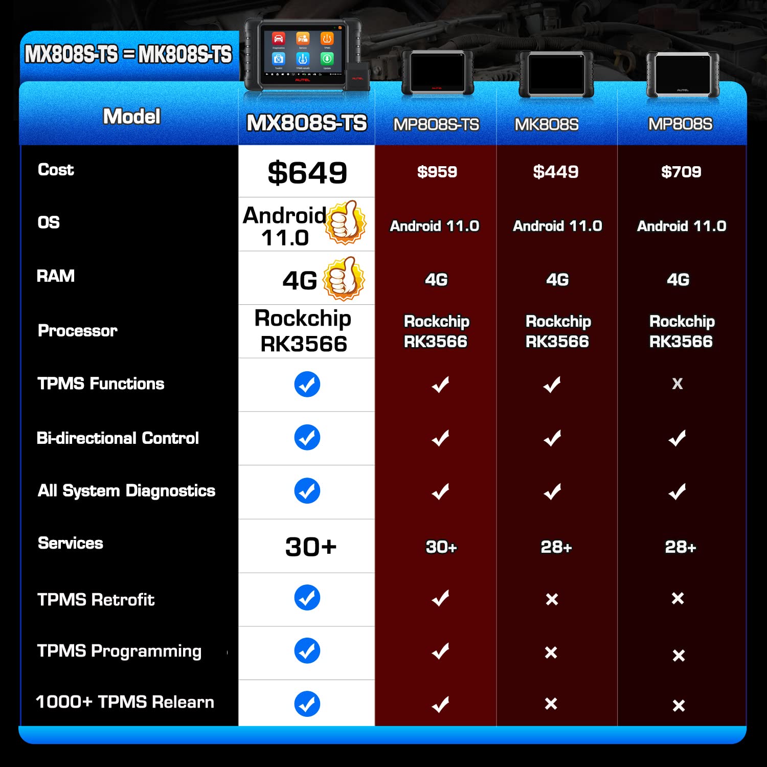 3. Lisää ominaisuuksia ja nopeammat ohjelmistopäivitykset, jotta voit diagnosoida uusia automalleja aiemmin kuin monet muut. Autel MaxiCheck MX808S-TS yhdistää myös edistyneet toiminnot, kuten täysi TPMS, 30+ huoltopalvelua, kaksisuuntainen ohjaus ja koko järjestelmän diagnostiikka — erinomainen yhdistelmä malleista MK808BT PRO + TS601.