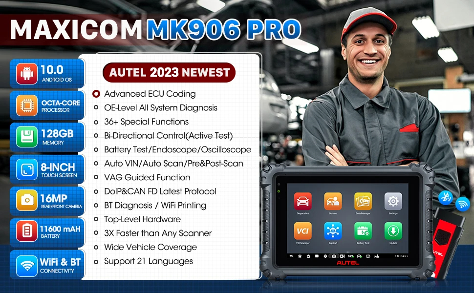 Autel MaxiCOM MK906S Pro on päivitetty Android 10.0 -järjestelmään ja varustettu tehokkaalla Qualcomm 660 -suorittimella, 4GB RAM -muistilla ja 128GB tallennustilalla sujuvaa käyttöä varten. 8-tuumainen 1920*1200 -kosketusnäyttö, kaksi 16MP kameraa ja 11600mAh akku mahdollistavat selkeän työskentelyn ja jopa 10 tunnin yhtäjaksoisen käytön.