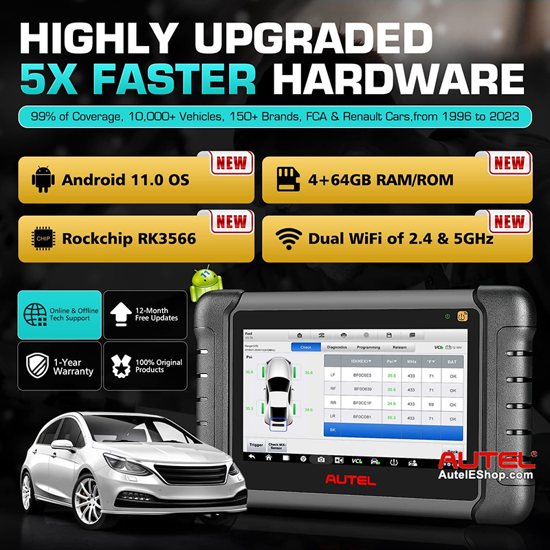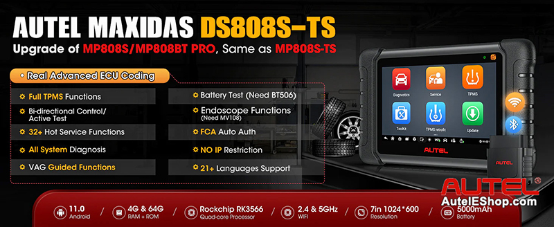 Autel MaxiDAS DS808S-TS yhdistää langattoman BT-yhteyden, täydet renkaanpaineen valvontajärjestelmän toiminnot, ohjausyksikön koodauksen, 36+ huoltotoimintoa, kaksisuuntaisen ohjauksen ja täyden järjestelmädiagnoosin. Laitteisto on päivitetty: Cortex-A55 -neliydinprosessori (1.8GHz), 4GB RAM ja 64GB sisäinen muisti, Android 11 -käyttöjärjestelmä sekä 5GHz kaksois-Wi‑Fi – suorituskyky jopa 4x aiempaa nopeampi.