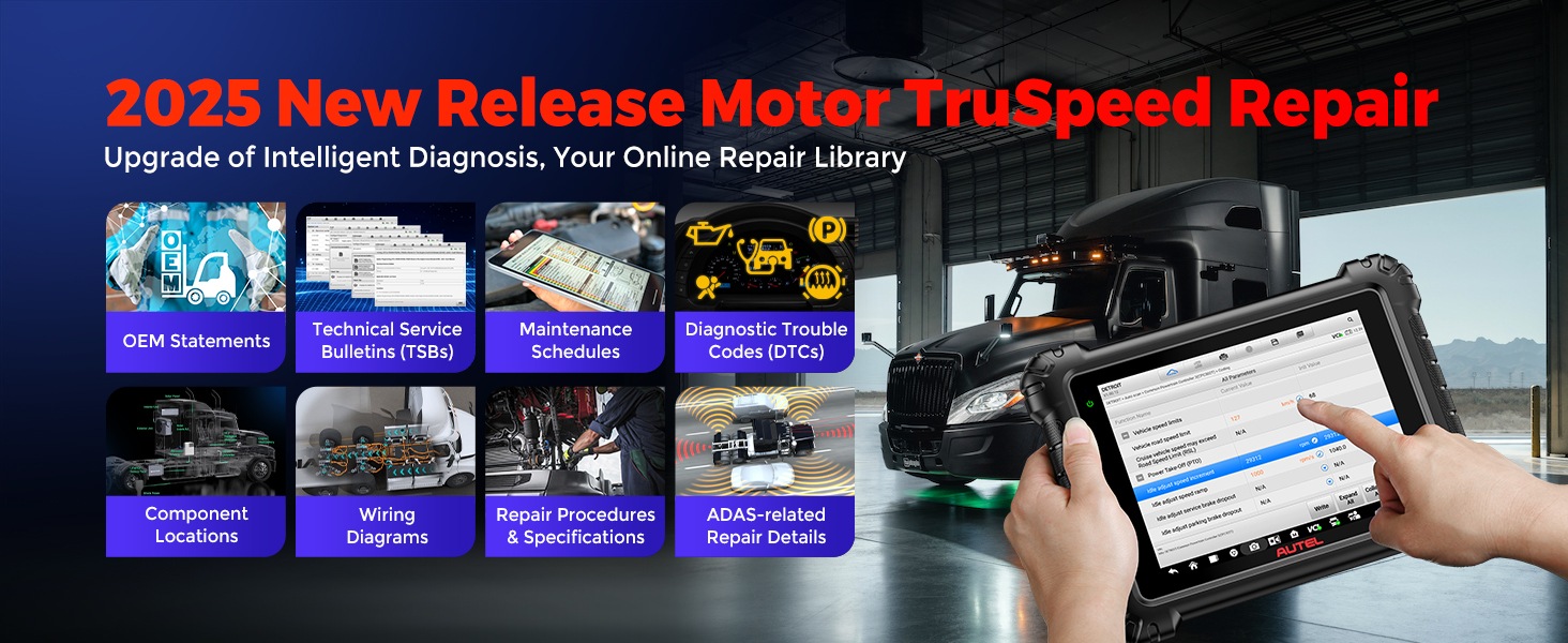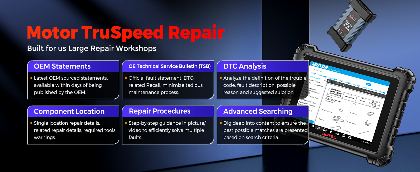 - Edistynyt moottoridiagnostiikka: tarjoaa TruSpeed-korjauksen yli 150 kevyelle, HD-dieselkuorma-autolle ja CV-ajoneuvolle. Sisältää yksityiskohtaiset komponenttien sijainnit, kytkentäkaaviot ja OE-valmistajan tekniset tiedot monimutkaisten korjausten sujuvoittamiseksi.