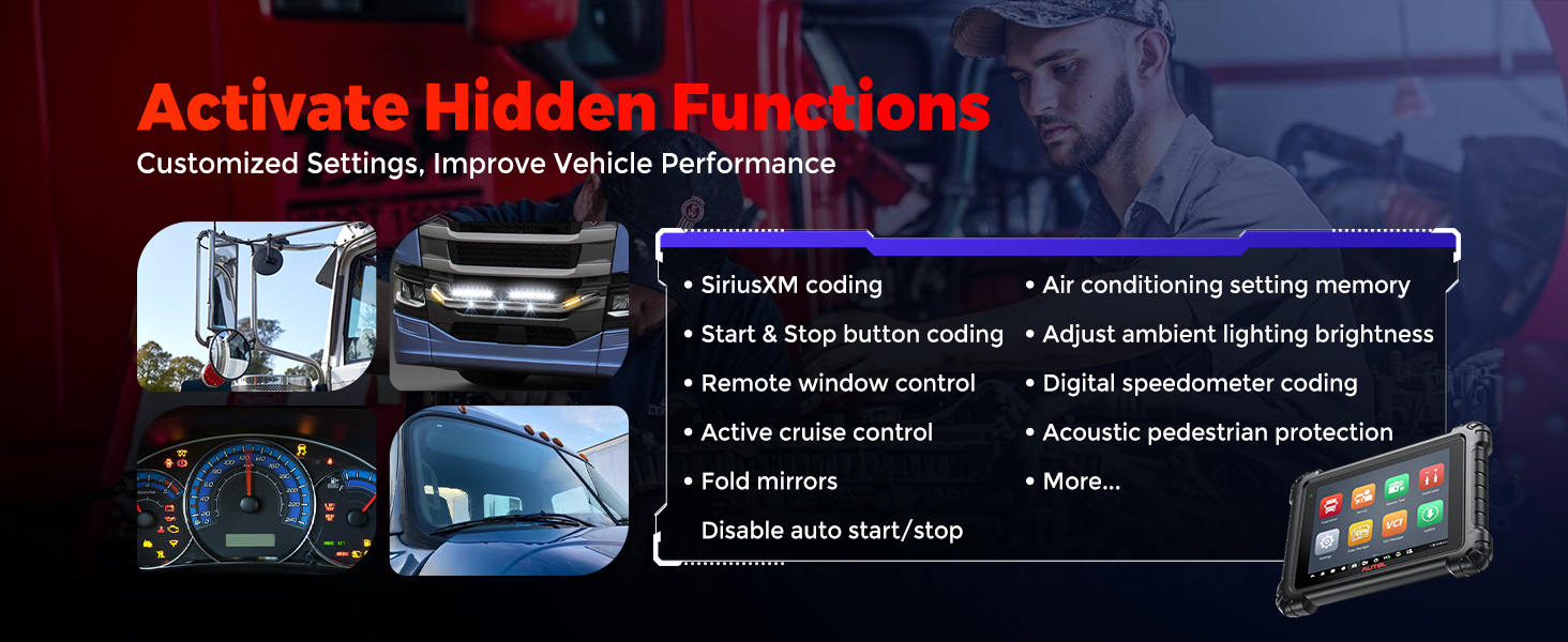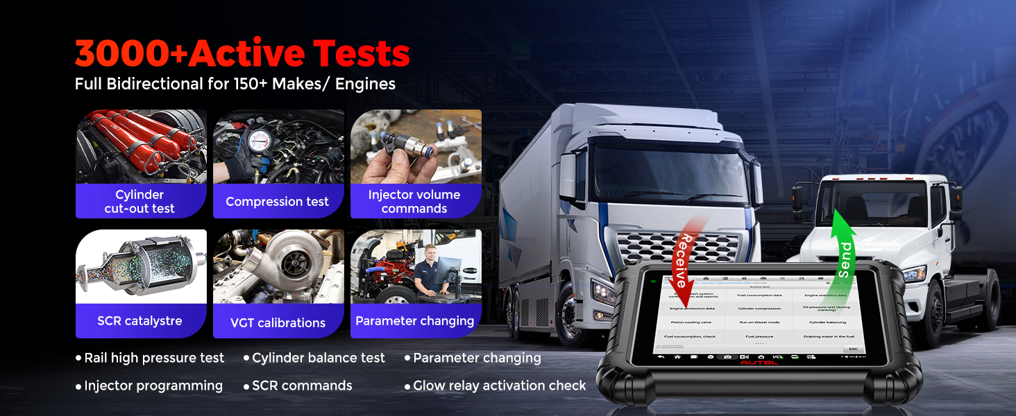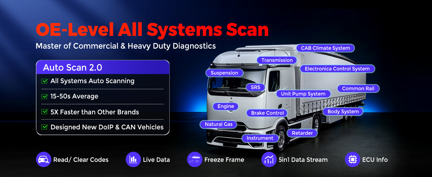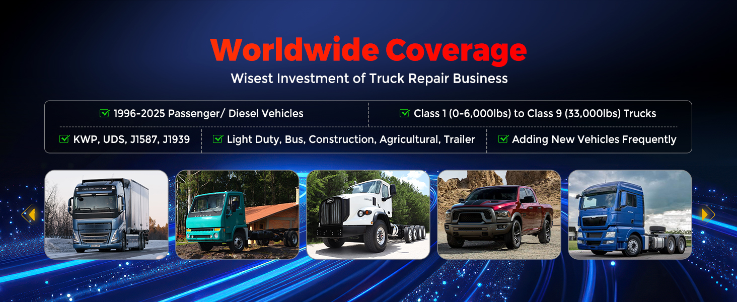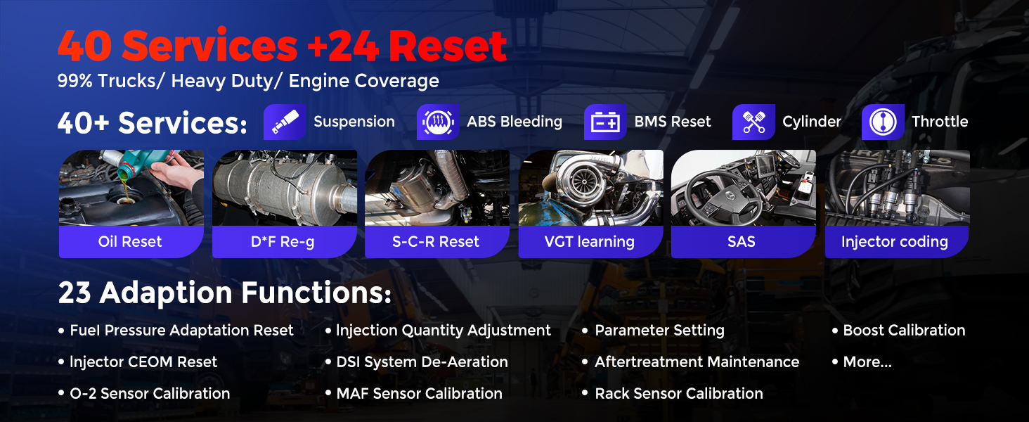 - Kuorma-autoihin räätälöidyt huoltotoiminnot: tukee 64+ nollausta ja mukautusta, kuten suutin- ja kaasuläpän koodaus, O2-anturin kalibrointi ja ABS-ilmaus kattavaa huoltoa ja kalibrointia varten.