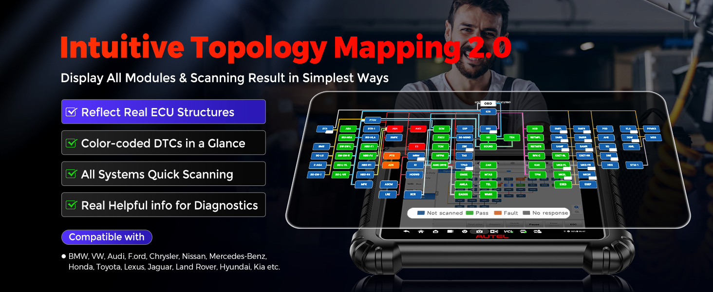 - Älykäs moduulikartoitus: varustettu Topologiakaavio 2.0 -toiminnolla, visualisoi todelliset piirikaaviot, paikantaa DTC-viat nopeasti ja tarkastelee moduuleja yhdessä näkymässä. Kattaa yli 150 automerkkiä tarkkaa diagnostiikkaa varten.