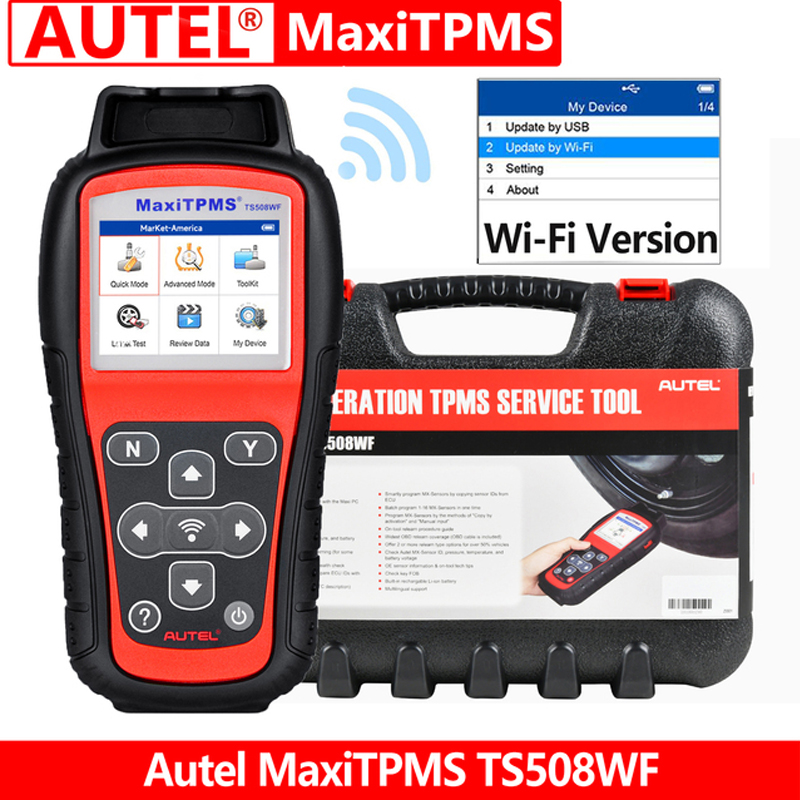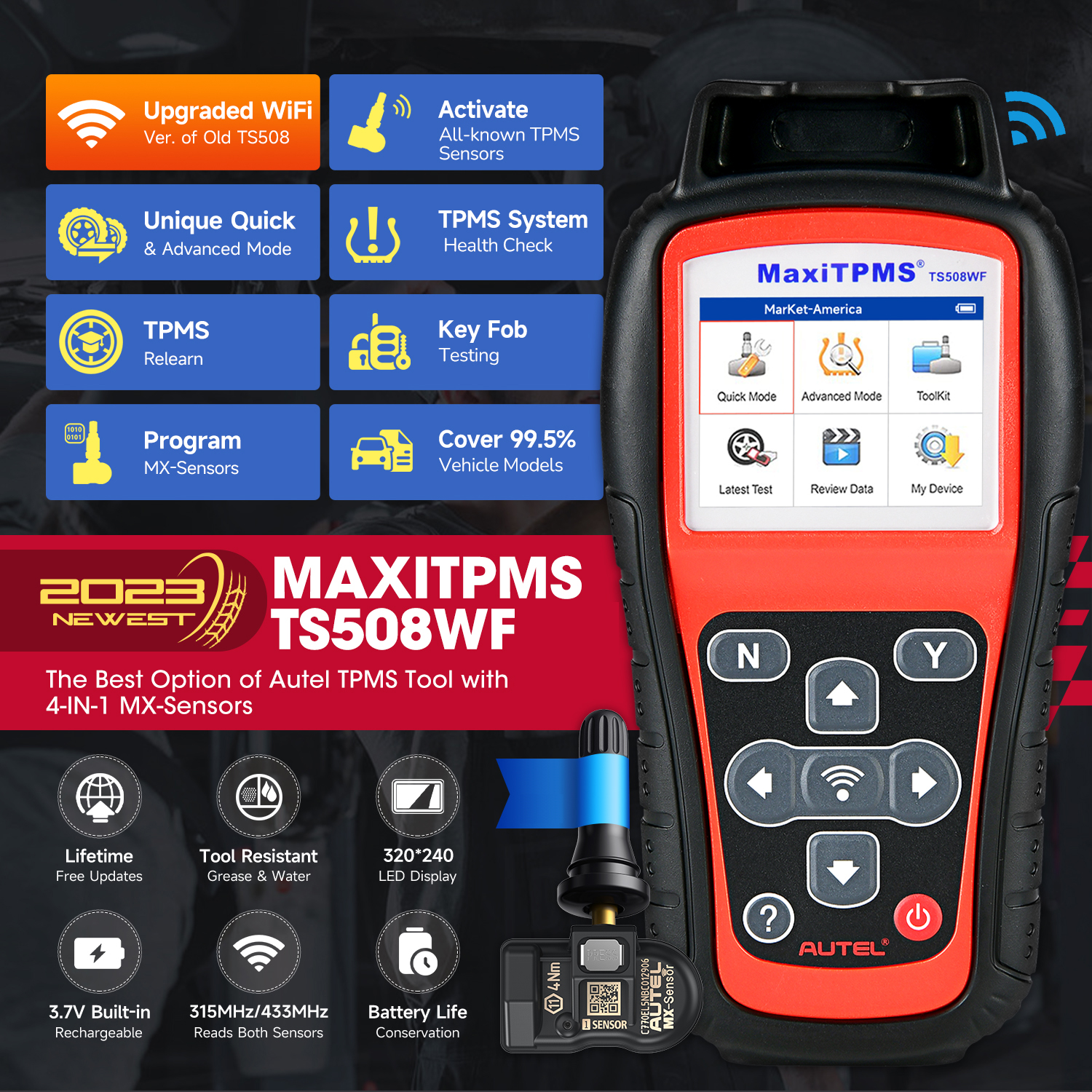 MaxiTPMS TS508WF on uuden sukupolven rengaspaineiden valvontajärjestelmän (TPMS) diagnostiikka- ja huoltotyökalu. Se aktivoi kaikki tunnetut TPMS-anturit, lukee antureiden tilan, tarkistaa järjestelmän kunnon, ohjelmoi Autel MX-sensorit ja suorittaa TPMS-uudelleenopetuksen. Valittavissa ovat Pika-tila ja Edistynyt tila, joilla työnkulku nopeutuu. Päivitykset onnistuvat kätevästi Wi‑Fi-yhteydellä.