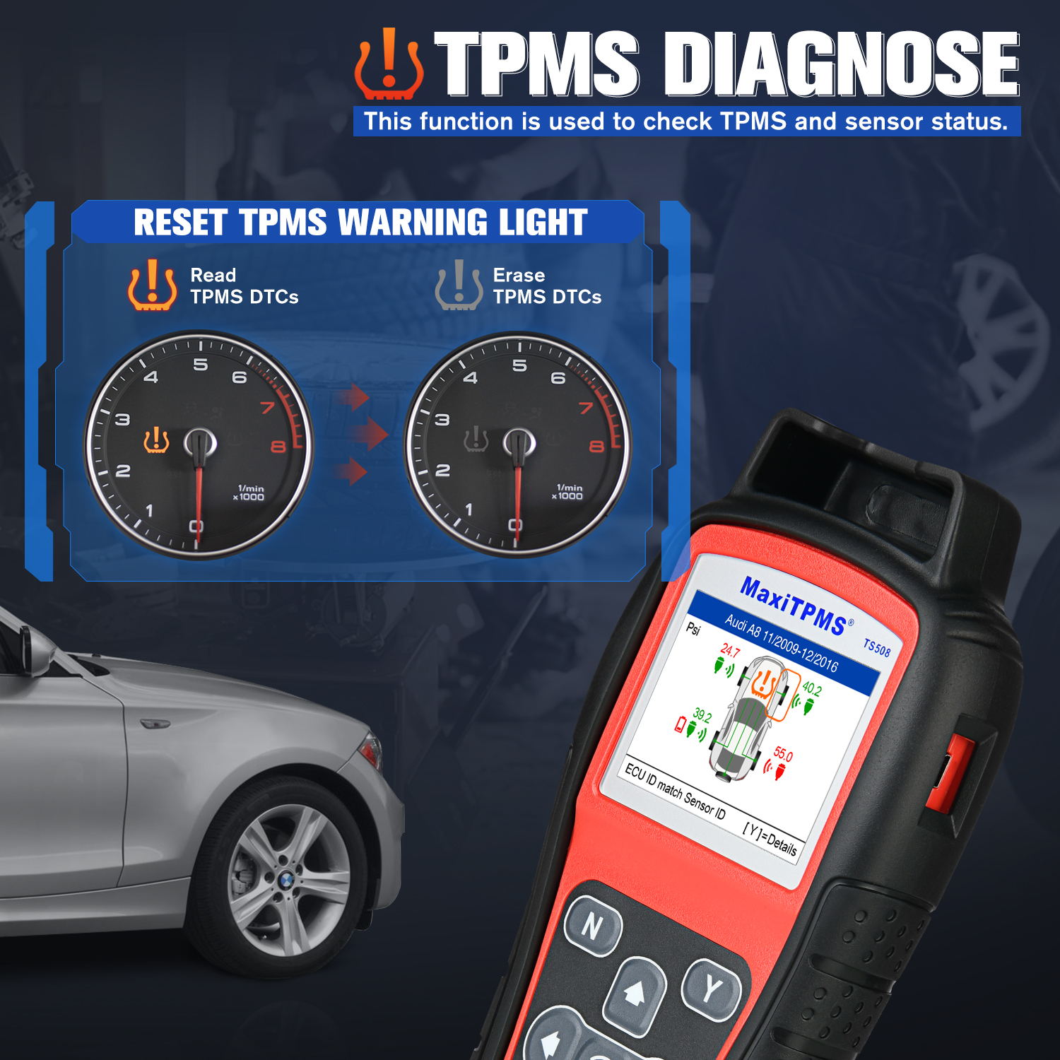 TS508 diagnosoi TPMS-järjestelmän OBDII-yhteyden kautta sekä lukee ja tyhjentää vikakoodit.