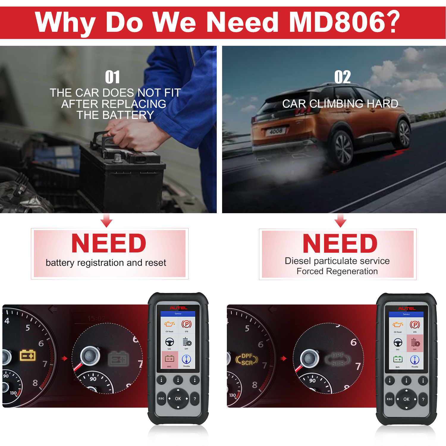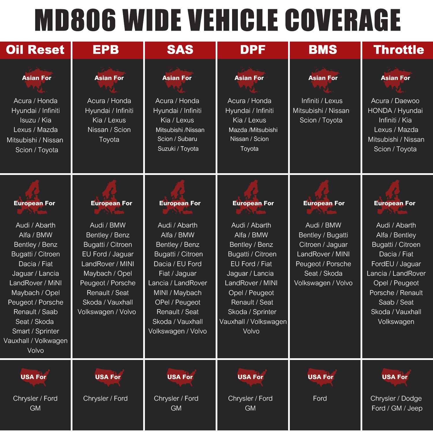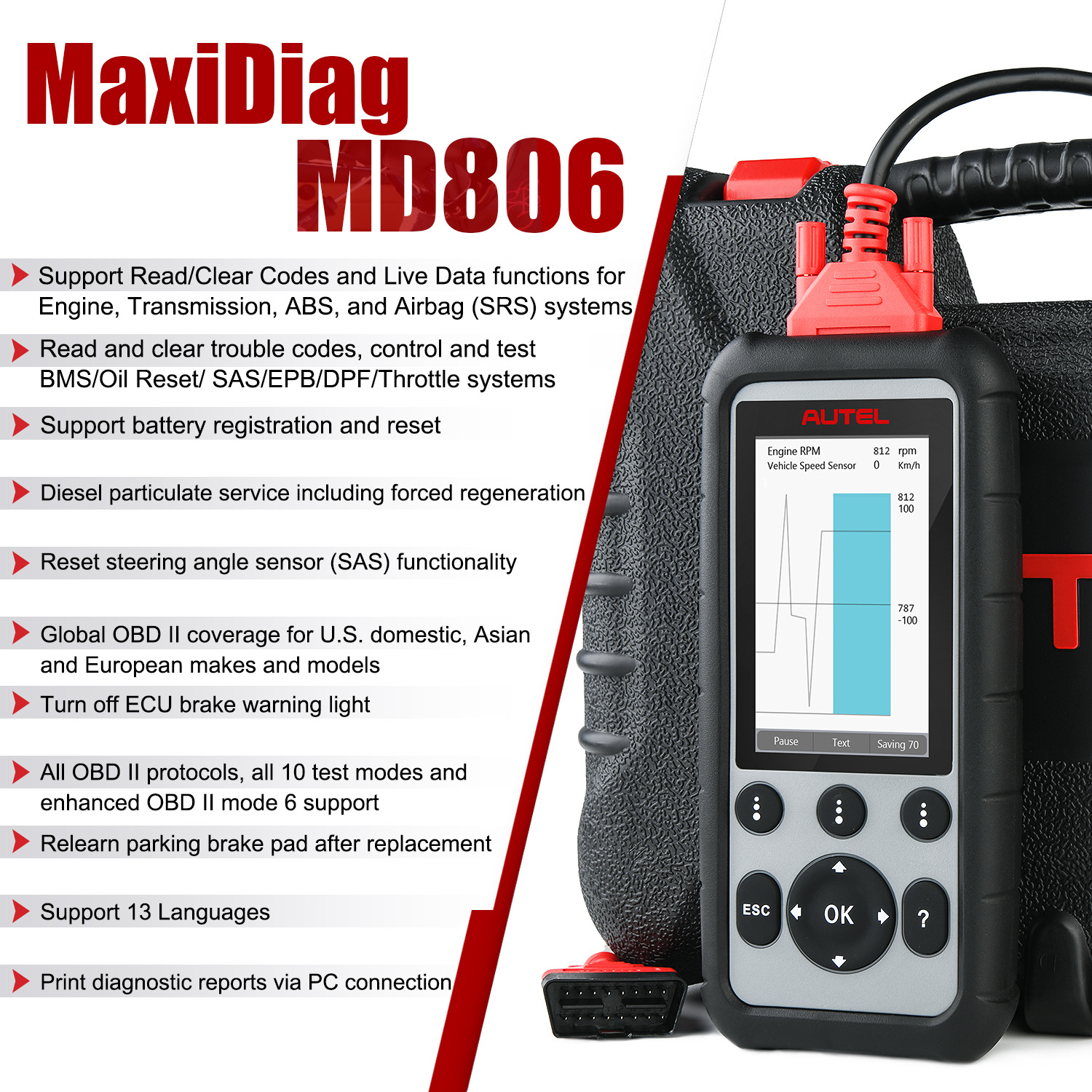 AUTEL MaxiDiag MD806 on kompakti diagnostiikkalaite, jolla teet moottorin, vaihteiston, ABS-jarrujen ja turvatyynyjärjestelmän (SRS) vianhaun nopeasti ja selkeästi. Laite sisältää mm. öljynhuoltovalon nollauksen, akun rekisteröinnin ja nollauksen, seisontajarrun palojen perusopetuksen vaihdon jälkeen, ohjauskulma-anturin perusopetuksen sekä dieselhiukkassuodattimen regeneroinnin. Kaikki tämä on koottu 4-tuumaiseen käsilaitteeseen.