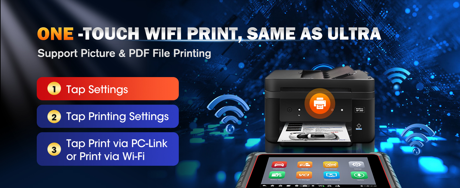 ● Wi‑Fi-tulostus: tulosta ajoneuvon terveystarkastusraportit mistä tahansa näkymästä.