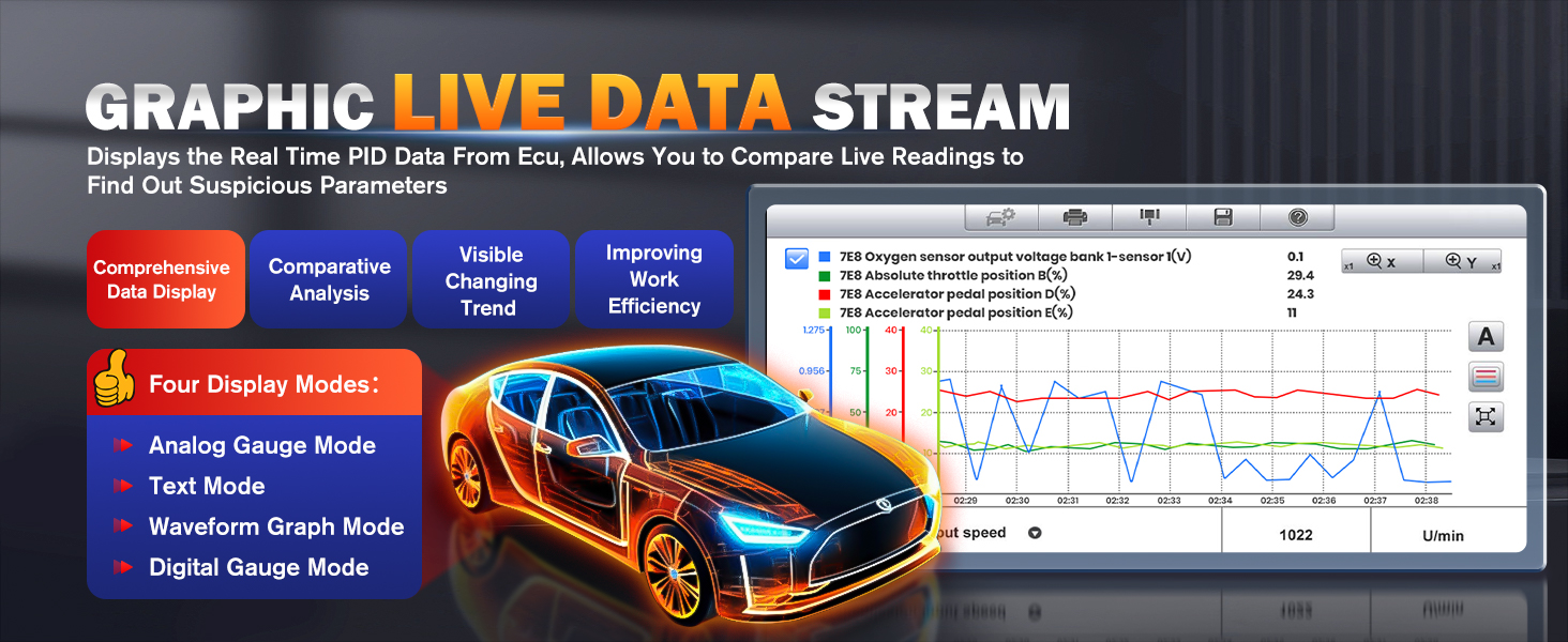 - OE-tason kokojärjestelmädiagnostiikka, reaaliaikainen 4-in-1 datakaavio, tallennus ja toisto.