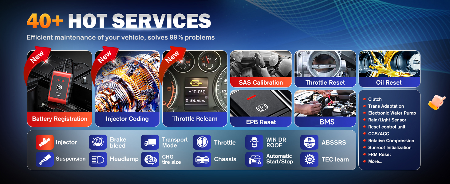 Edistyneet merkkikohtaiset palvelut: nollakohdan oppiminen, vääntöanturin säätö, signaalitarkistus, kaarrenopeusanturin (YRS) oppiminen, kytkimen polkimen asennon oppiminen, sylinterin tehon tasapaino, komponenttisovitus, start/stop-nollaus, kuljetustila, auton ovien lukitusasetukset jne.